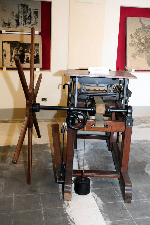 Torchio litografico a stella costruzione in legno della soc. "Bollito & c." di Torino.\nUtilizzato per la stampa litografica diretta con pietre fino al formato 35 x 50