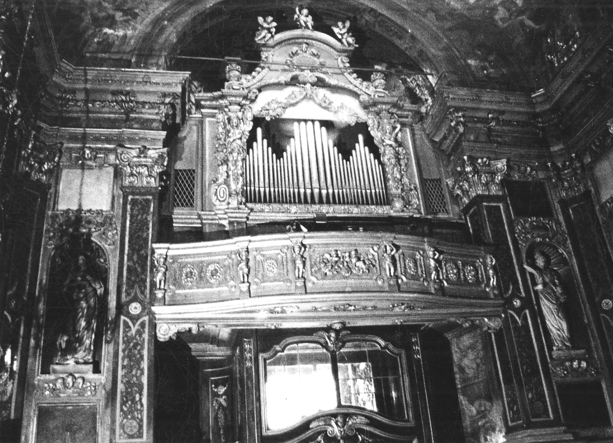 organo ubicato in cassa lignea riccamente decorata con fregi, festoni, anfore, cariatidi e angeli sulla sommità del timpano