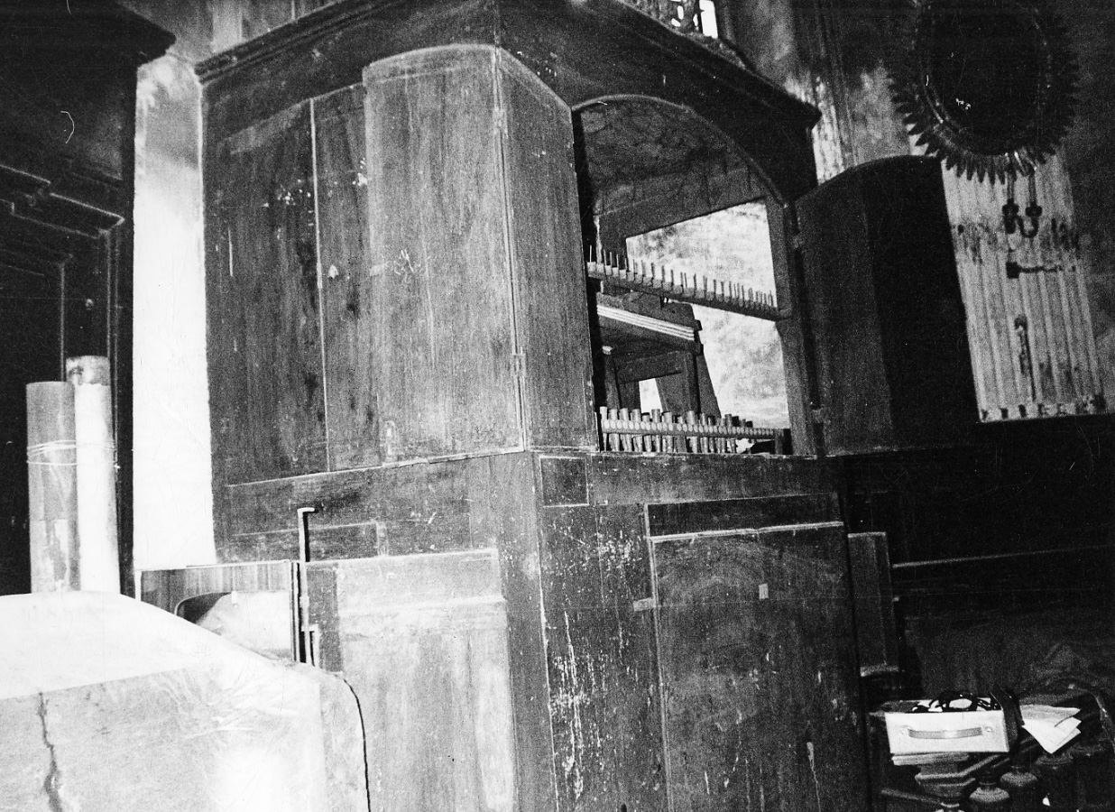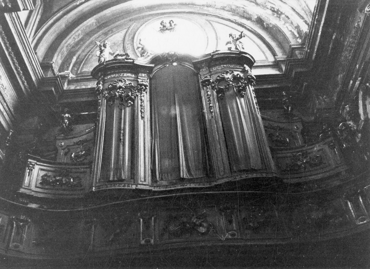 - NOTIZIE STORICO CRITICHE Lo strumento è completamente abbandonato: si notano sette canne ad ancia intere, 26 con solo piedino, il crivello distorti, il somiere, in alto il mantice sfondato, in fondo le canne in legno (in buono stato). Rimane la parte di trasmissione meccanica originale anche se deteriorata. Sopra la porta centrale della chiesa in tribuna e cassa di pregevole fattura esiste un secondo strumento di notevoli dimensioni a tre campate, completamente sprovvisto di canne. Lo stato degli strumenti pare sia dovuto alla situazione bellica. La chiesa è chiusa al culto