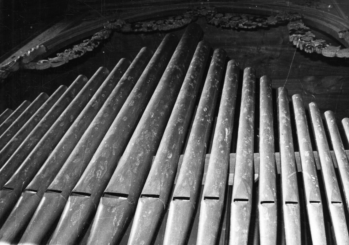organo ubicato in cassa lignea. Sul timpano decorazioni di festoni dorati