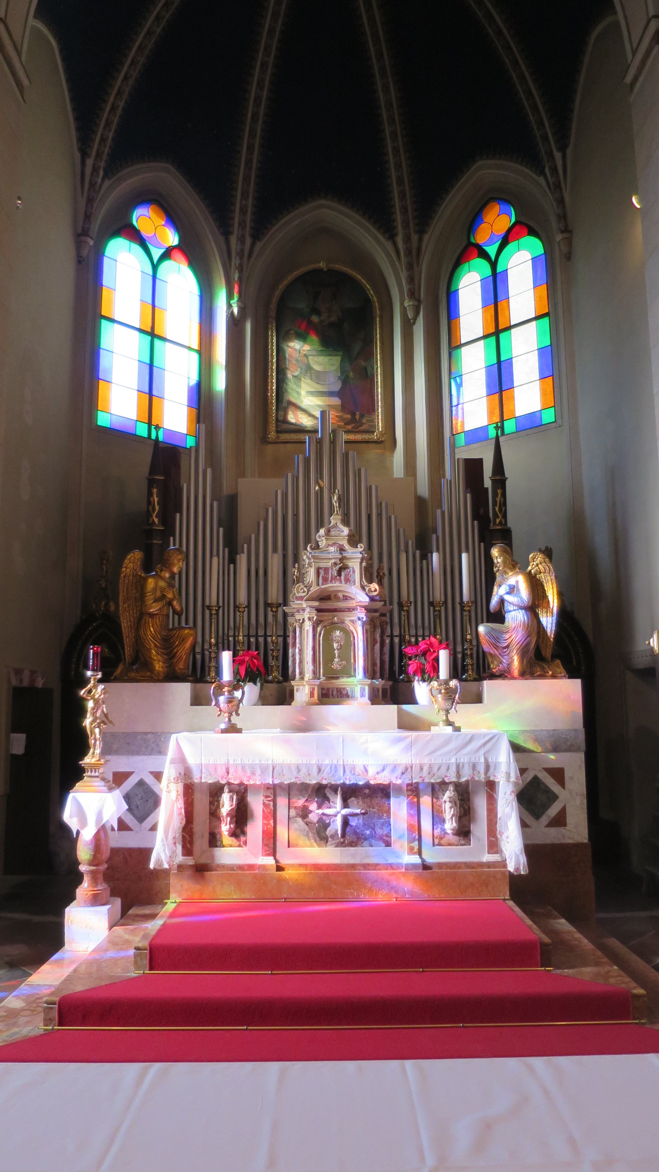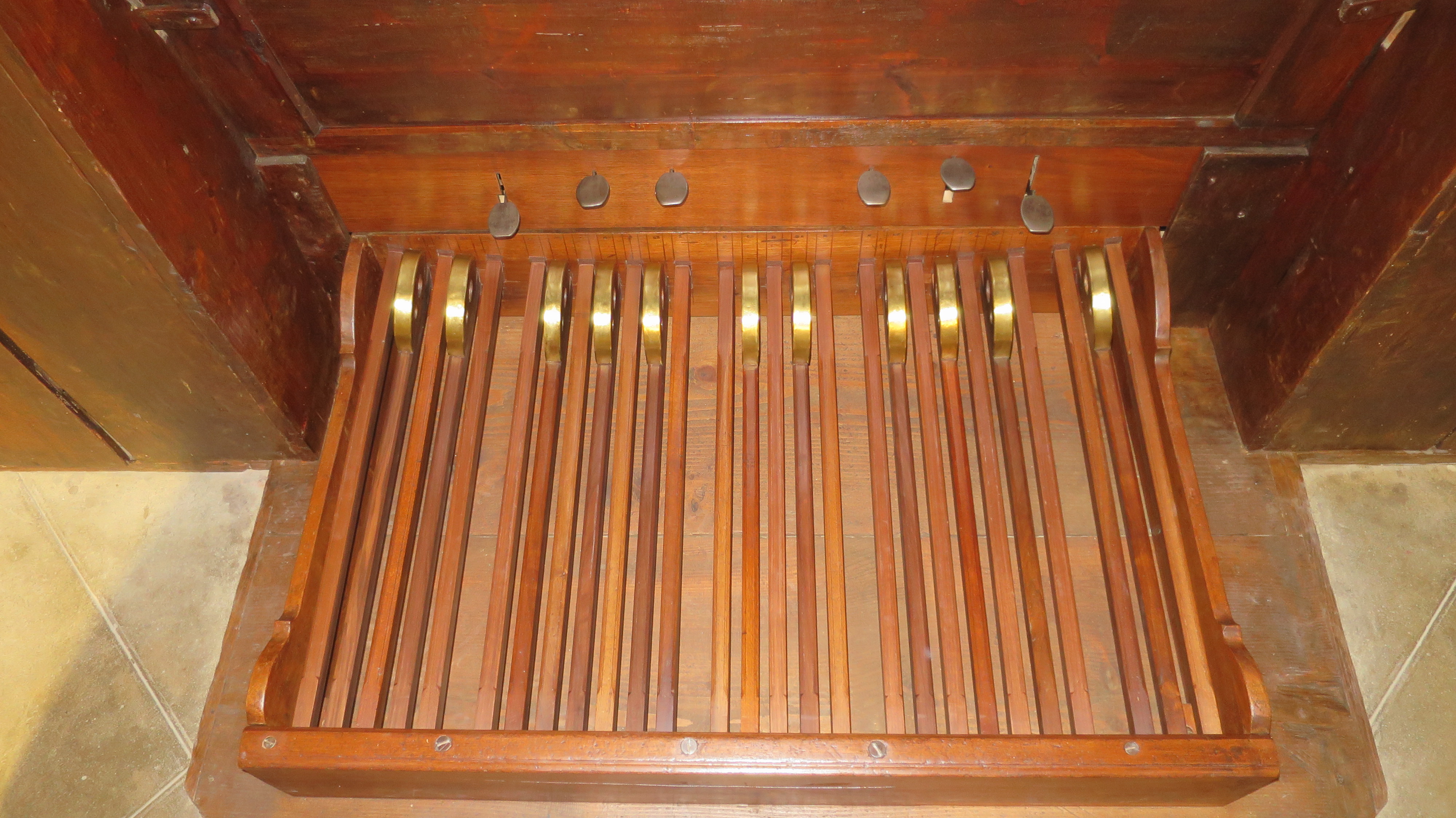 organo con prospetto privo di cassa, con basamento in legno tinto noce, listello di finitura con elementi decorativi dorati e due colonne lignee ai lati del prospetto di canne, sovrastate da un elemento decorativo di forma triangolare, con elementi decorativi dorati
