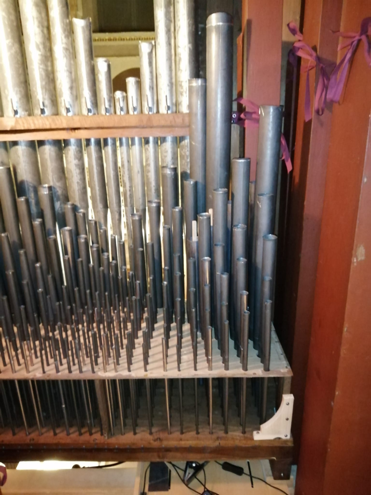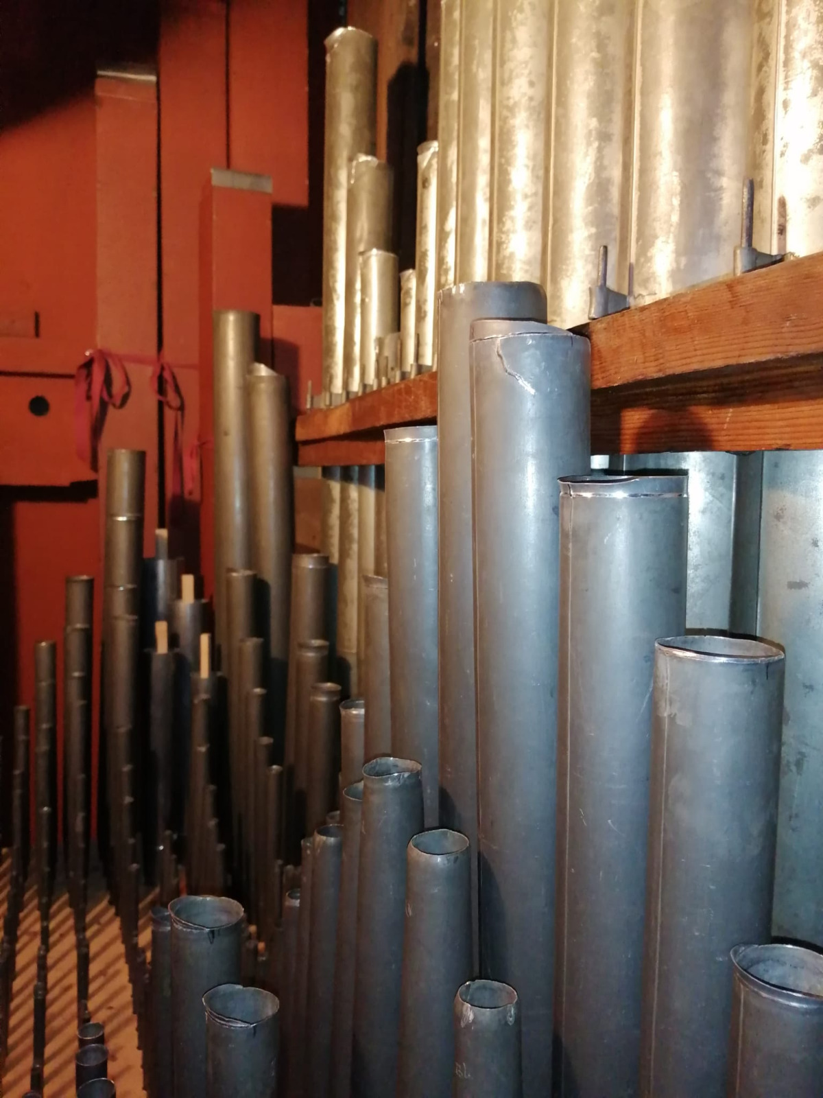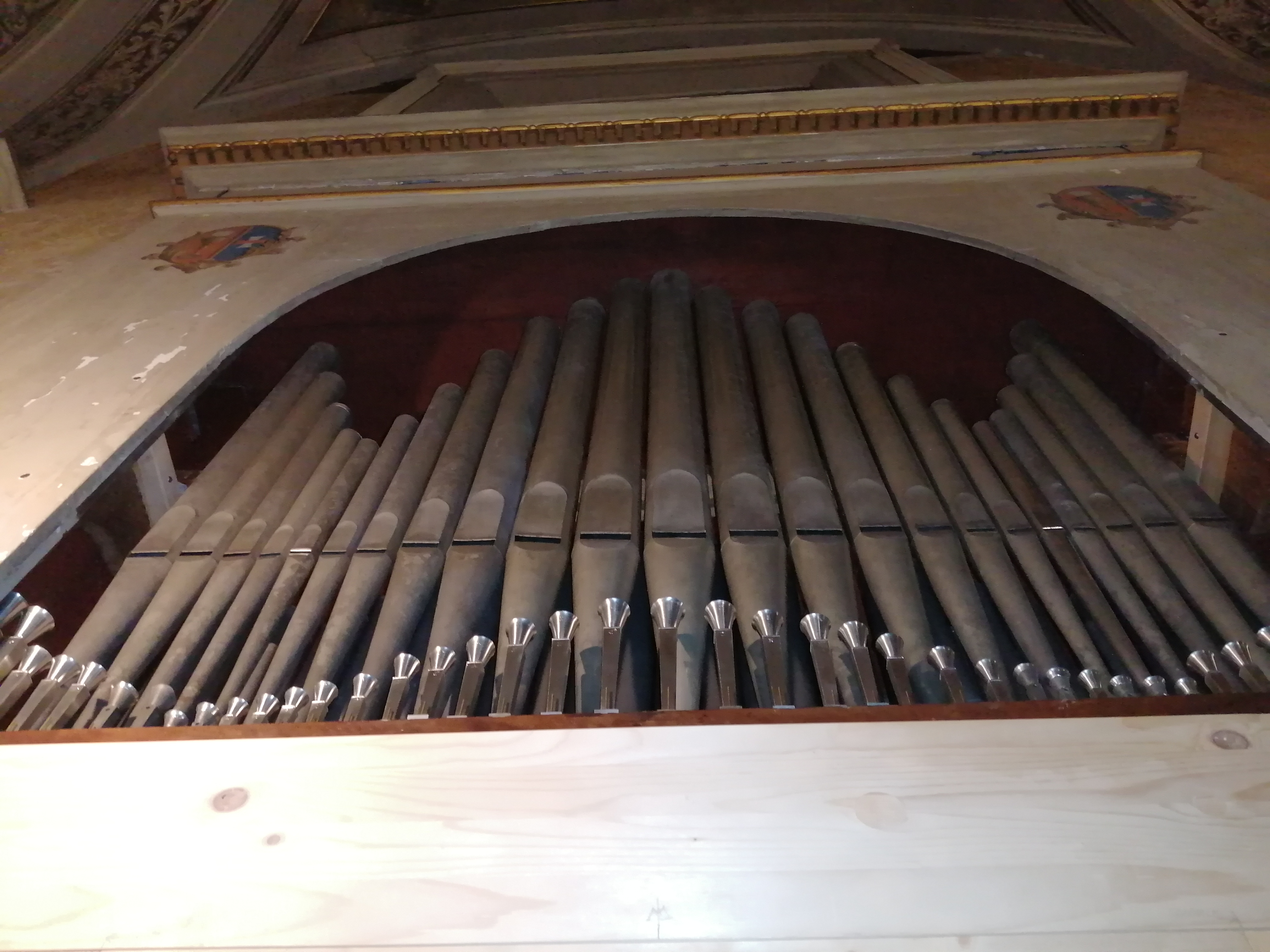 organo collocato in cantoria lignea con pavimento in mattoni, parapetto diritto sormontato da struttura con 3 grate apribili orizzontalmente e fregio floreale centrale, diviso in tre specchiature ognuna con elemento decorativo; cassa lignea inserita nel muro con prospetto dipinto semplicemente a tempera uniforme, 2 stemmi dipinti ai lati del vano delle canne. Vano delle canne arcuato sormontato da cornice a trabeazione e dentellatura