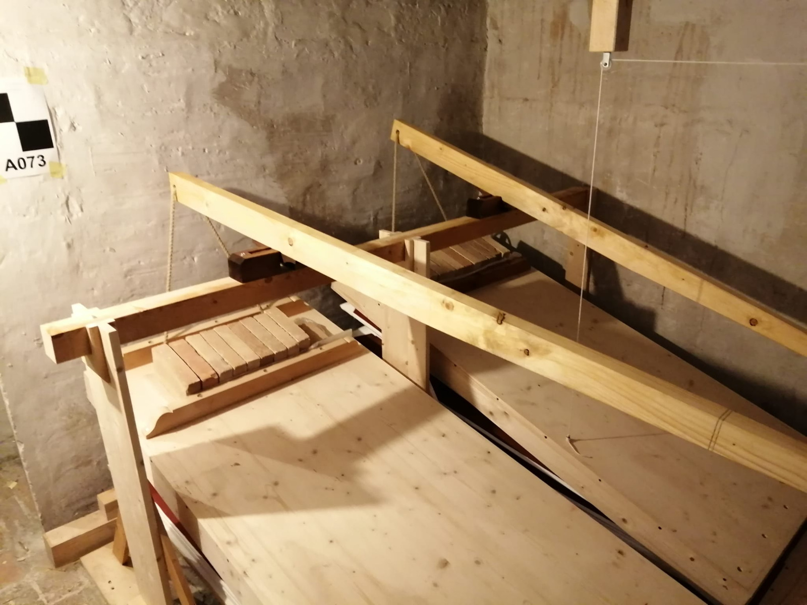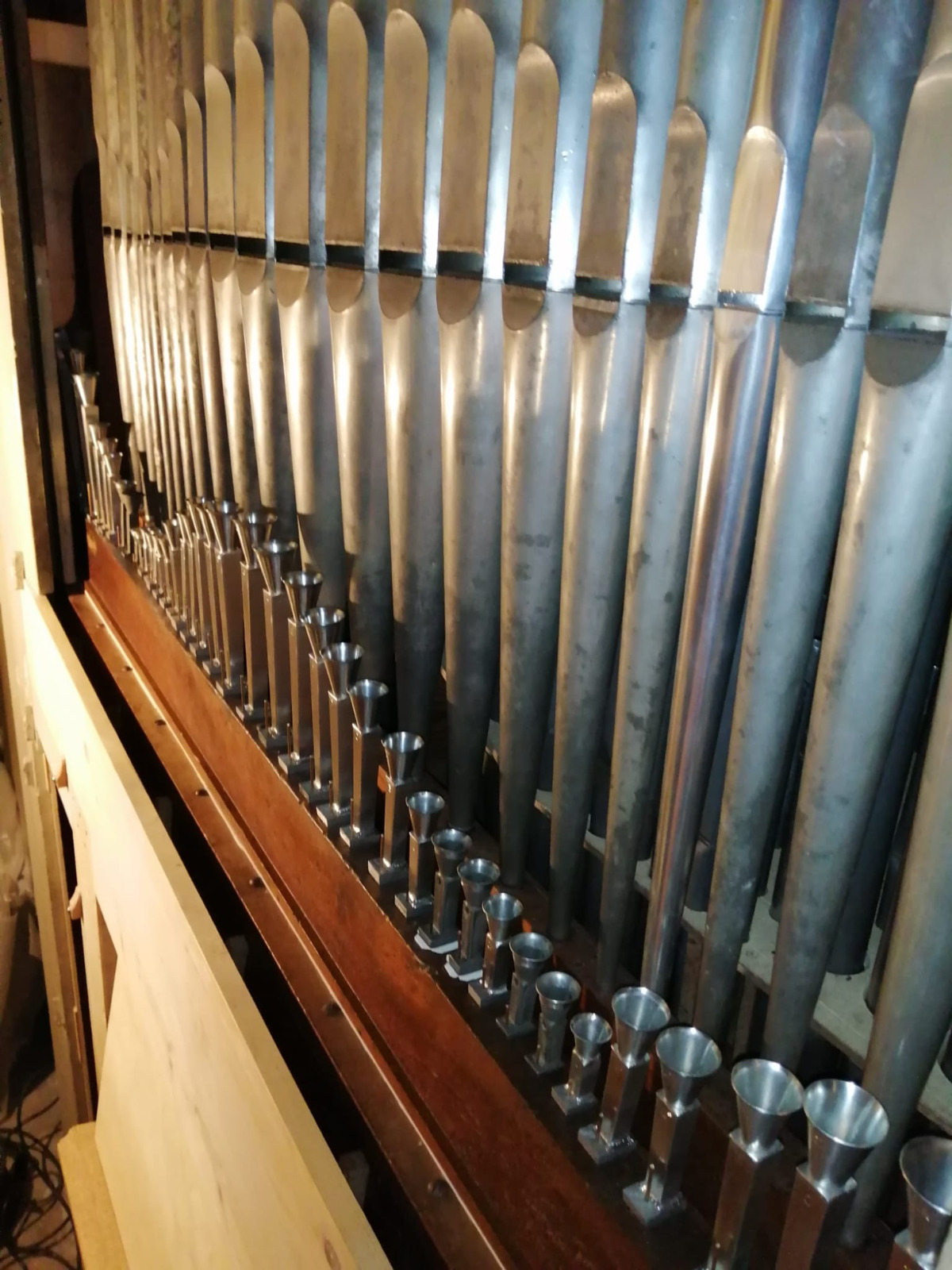 - NOTIZIE STORICO CRITICHE Lo strumento è stato costruito nel 1755 da Pietro Nachini, come riporta l'iscrizione sul supporto ligneo del leggio, per la chiesa di S. Benedetto in Osimo. Successivamente trasferito, nel XIX secolo, nella chiesa di S. Palazia dove è rimasto fino al 2021 (anno dello smontaggio in occasione dell'ultimo restauro, durante il quale è stato deciso che venisse rimontato in altra chiesa, viste le condizioni precarie del sito di S. Palazia ed i danni subiti in seguito al terremoto); nel 2025, al termine del restauro, lo strumento è stato rimontato nella chiesa della SS. Trinità, dove però il rimontaggio in spazi più ristretti ha comportato alcune difficoltà che verranno trattate nel paragrafo relativo al restauro. Nel corso dei secoli ha subito diversi interventi a partire dall'aggiunta del somiere di basseria da parte di Gaetano Callido (documentato da iscrizione a fuoco dell'inconfondibile monogramma callidiano "G+C" e la "O" per Osimo), modifica della quota di tale somiere con aggiunta di gambe, eliminazione delle prime canne del Flauto in XII con chiusura dei fori sulla coperta con colla, carta e gesso, sostituzione della manticeria originale con altra di costruzione mediocre. Nella metà del 1800 la stessa manticeria è stata ridotta con eliminazione di un mantice e trasformazione in mantice serbatoio del superstite con aggiunta di 2 pompe sottostanti. In sintesi, gli interventi sullo strumento sono stati: Gaetano Callido (metà del XVIII sec.) Mariano Rughini (nel 1856e nel 1860), Pietro Cioccolani (nel 1864 e nel1870), Ditta Burroni (prima metà 1900). Infine il restauro di Riccardo Sabatini di Pesaro nel 2025, che lo ha riportato alla fisionomia originale. Il supporto recante l'iscrizione che ha determinato la paternità e la datazione dello strumento non è stato reintegrato in quanto, dopo lo spostamento da S. Palazia a SS. Trinità, gli spazi erano ridotti e la tavola non poteva essere utilizzata; adesso è in attesa di essere restaurata per essere poi musealizzata. La panca originale, non restaurata, è rimasta a S. Palazia