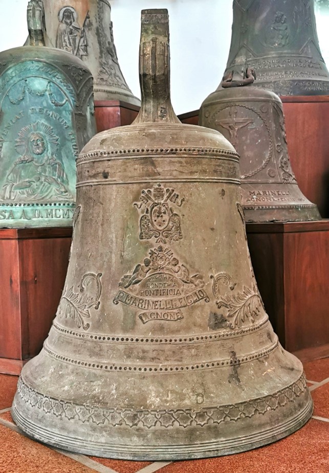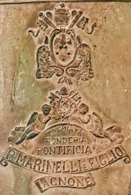 - NOTIZIE STORICO CRITICHE L’iscrizione posta sulla campana riferisce di una tradizione ancora viva: il rito cristiano della benedizione che la rende una creatura sacra. In questo caso la campana ci dice che porterà il nome della sua madrina: Maria. Ogni campana riceve un battesimo e viene distinta da un nome proprio attribuito dal committente nel momento rituale della fusione. Questa campana conservata nel Museo Marinelli ha su di se una particolare caratteristica storica perché è la prima testimonianza della benemerenza ricevuta nel 1924 da papa Pio XI. Si tratta del TITOLO PONTIFICIO col quale Pio XI autorizza la ditta Marinelli ad innalzare il Suo Stemma su tutte le campane da essa prodotte. Questo raro riconoscimento, ottenuto “per merito” e concesso ancora per un breve lasso di tempo a pochissime aziende “esemplari”, ad oggi è conservato esclusivamente dai fonditori di Agnone. Su questa campana lo scudo bipartito con l’Aquila e le tre sfere, distintivo di papa Ratti, compare due volte: grande e centrale a certificare la validità del TITOLO PONTIFICIO e più in basso, retto da puttini, inserito nello stemma di fabbrica. Da notare gli angeli che lo scultore Felice D’Onofrio collocherà su moltissime delle sue campane. Dopo un secolo gli stessi angeli, ottenuti dai vecchi stampi di gesso, decorano le facce laterali della prima campana fusa per il Giubileo del 2025 che ha accompagnato coi suoi rintocchi l’apertura della Porta Santa a S. Pietro il 24 dicembre del 2024