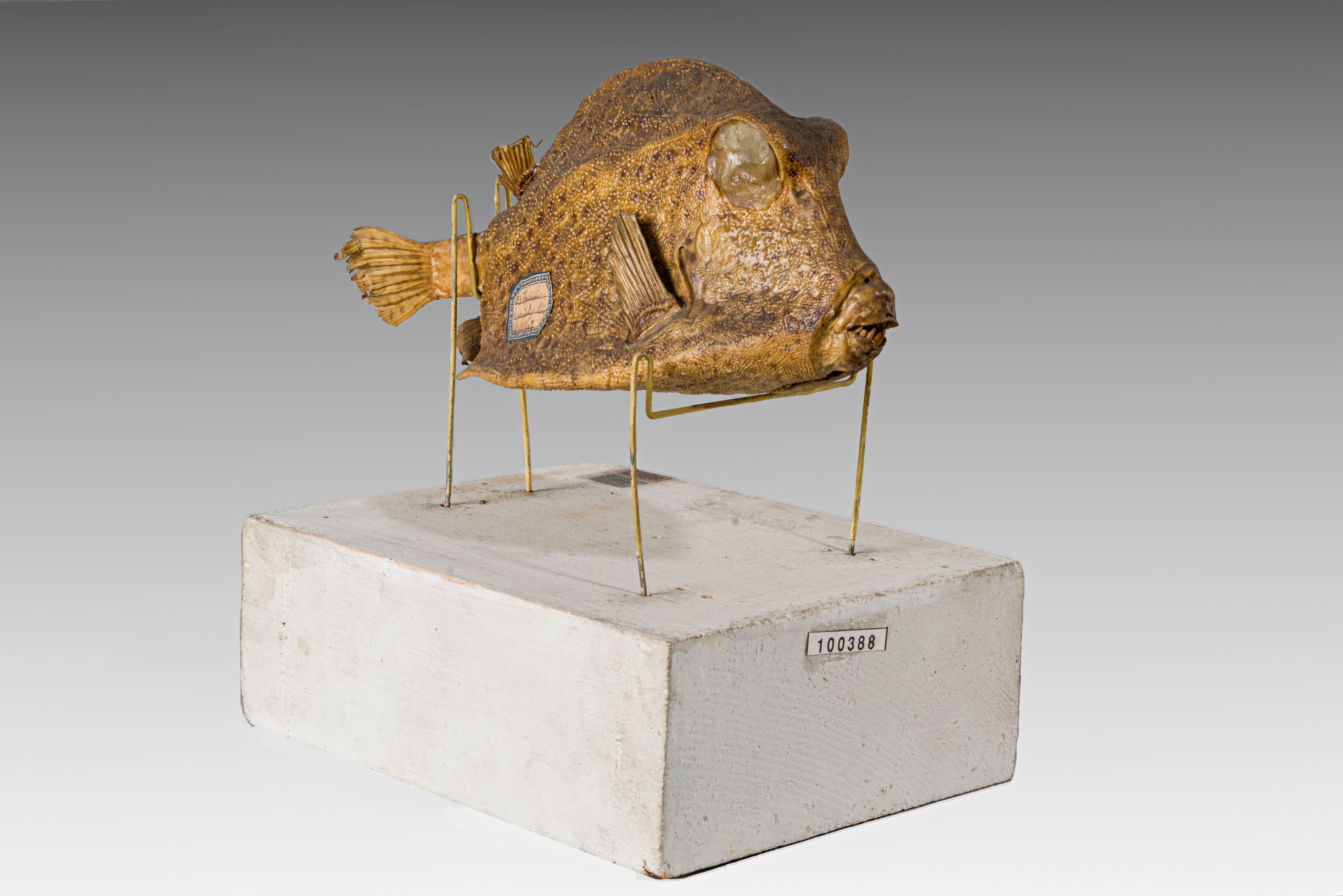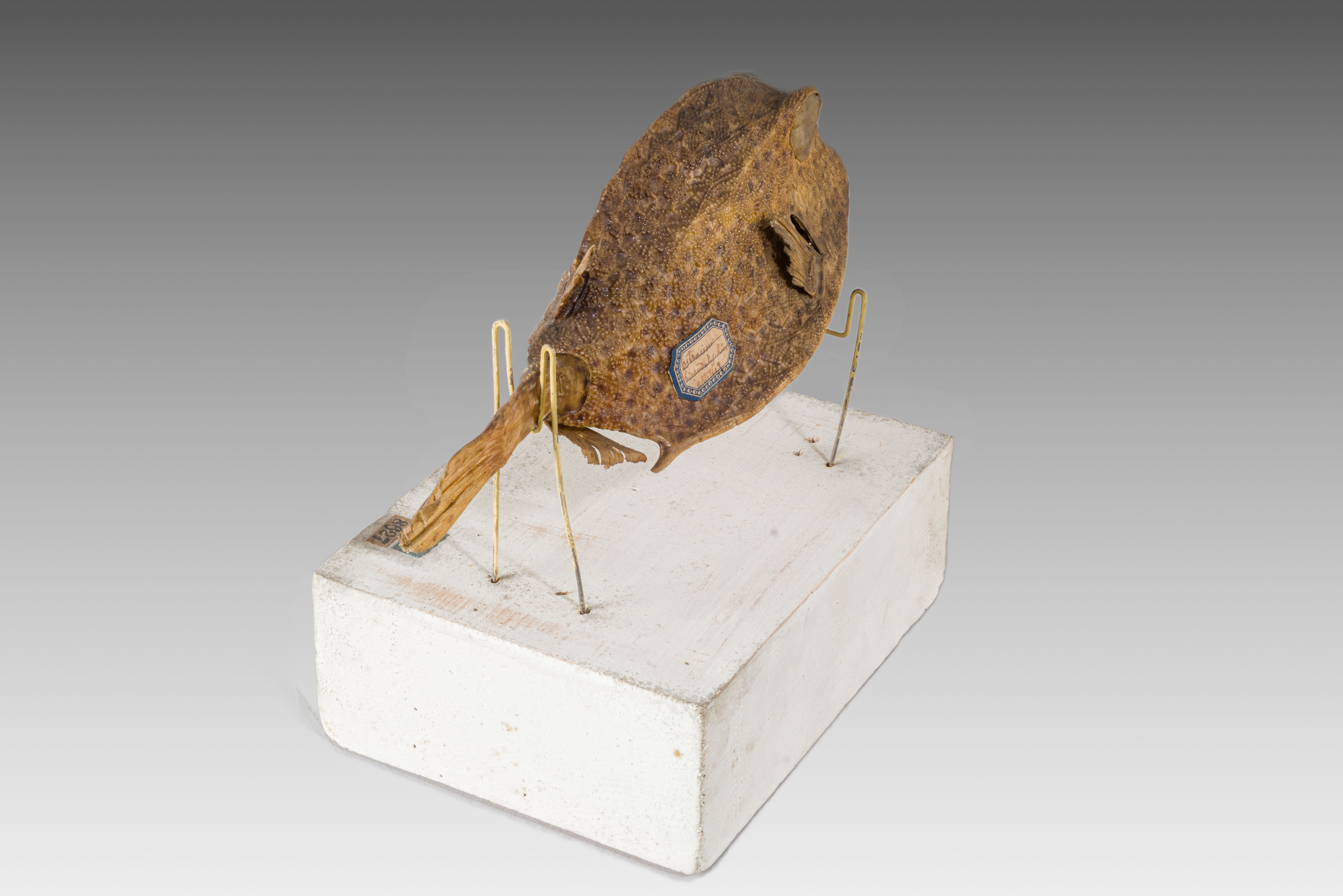 Pesce scatola (nome UA Obstracion): pesce essiccato su base verniciata di bianco, sostegni di filo metallico sagomato