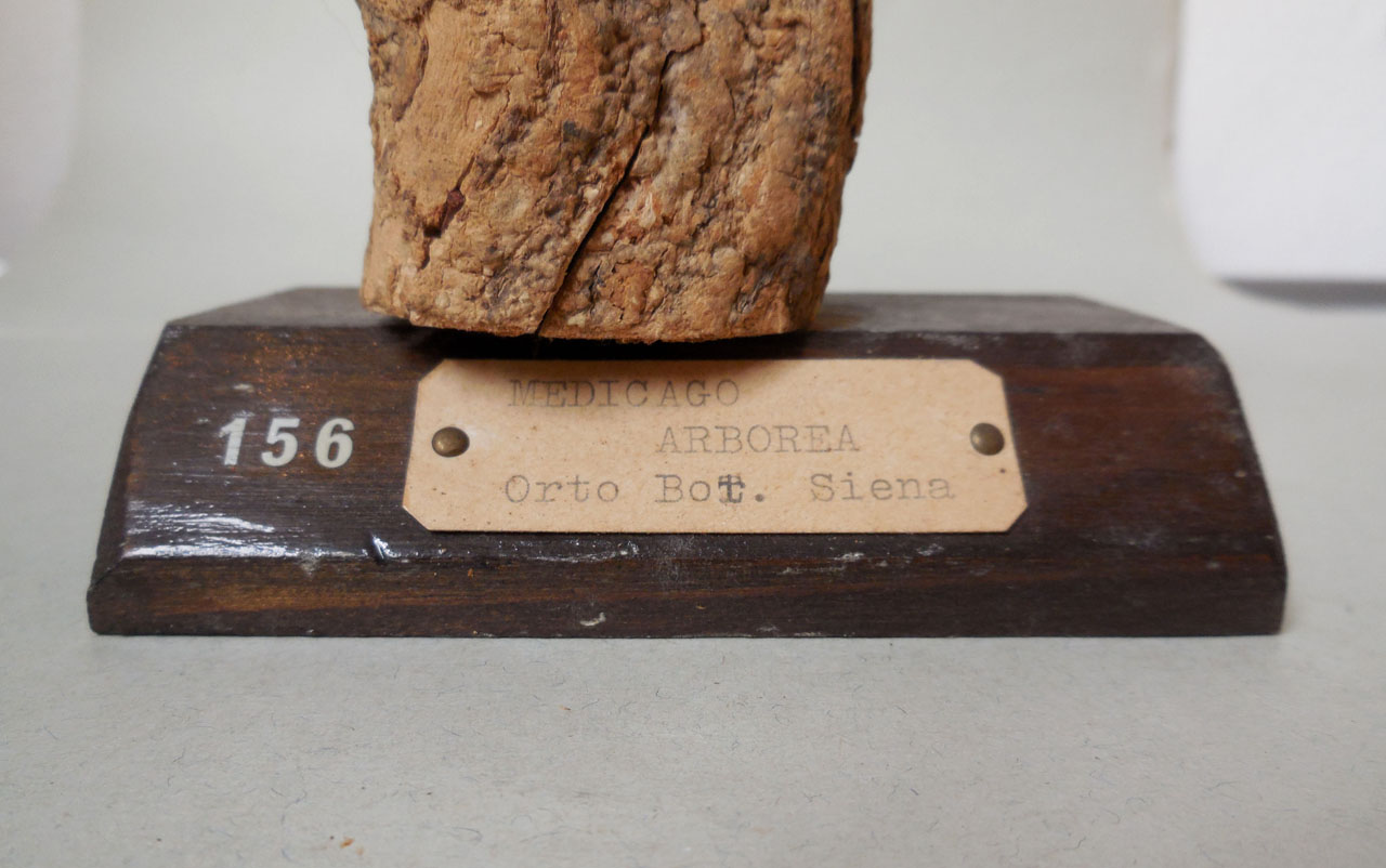 Il campione è uno spezzone di legno grezzo munito di corteccia, ricavato dal taglio di un tronco o di un ramo, successivamente sistemato su un supporto ligneo sul quale si trova un numero d'ordine e il cartellino che riporta il nome scientifico della specie. Il campione fa parte di una collezione nata grazie al lavoro del Prof. B. Longo e del Prof. A. Preda, direttori dell'Orto Botanico di Siena rispettivamente dal 1906-1915 e dal 1915-1921. Nella collezione vennero radunati i campioni raccolti dal Prof. A. Tassi e altri reperti legnosi provenienti dall'Orto, molti dei quali recuperati nel 1915 dalle piante strocatesi durante una nevicata. La collezione è stata incrementata fino alla fine degli anni '50 per merito del Prof. A. Nannizzi, direttore dell'Orto dal 1934 al 1950