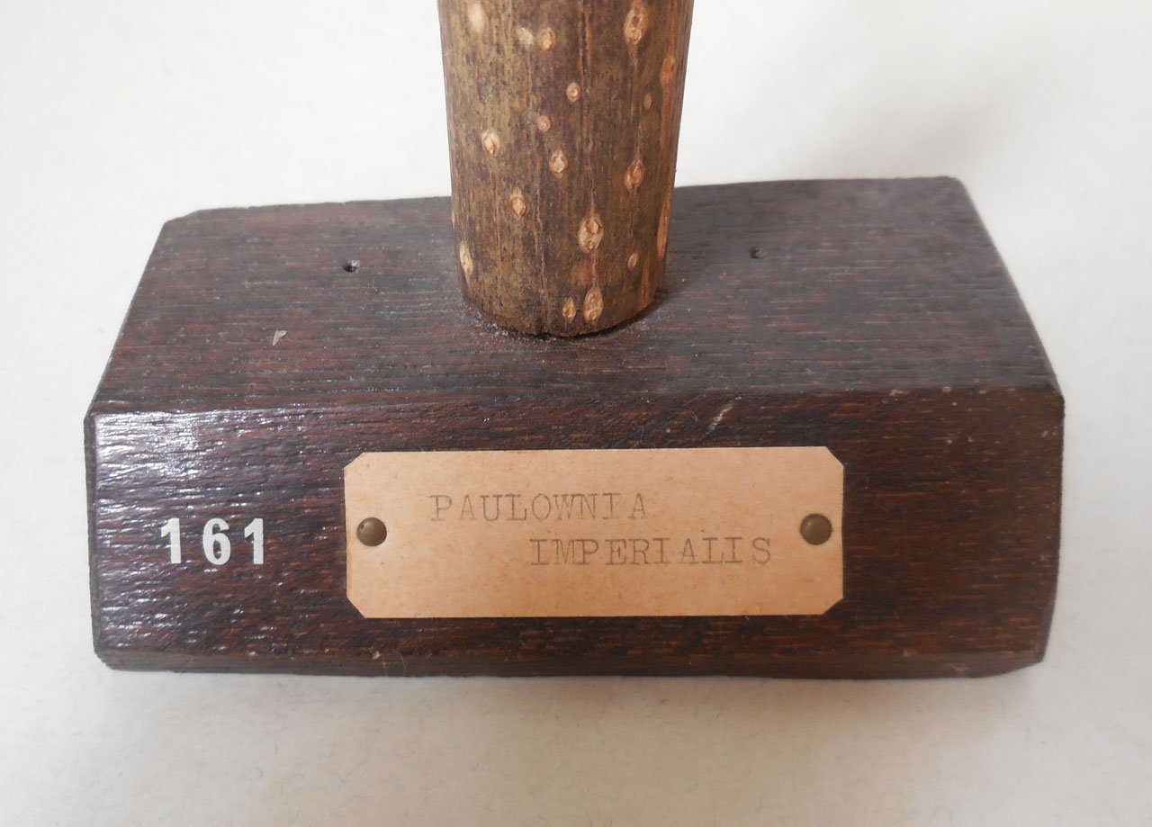 Il campione è uno spezzone di legno grezzo munito di corteccia, ricavato dal taglio di un tronco o di un ramo, successivamente sistemato su un supporto ligneo sul quale si trova un numero d'ordine e il cartellino che riporta il nome scientifico della specie. Il campione fa parte di una collezione nata grazie al lavoro del Prof. B. Longo e del Prof. A. Preda, direttori dell'Orto Botanico di Siena rispettivamente dal 1906-1915 e dal 1915-1921. Nella collezione vennero radunati i campioni raccolti dal Prof. A. Tassi e altri reperti legnosi provenienti dall'Orto, molti dei quali recuperati nel 1915 dalle piante strocatesi durante una nevicata. La collezione è stata incrementata fino alla fine degli anni '50 per merito del Prof. A. Nannizzi, direttore dell'Orto dal 1934 al 1950