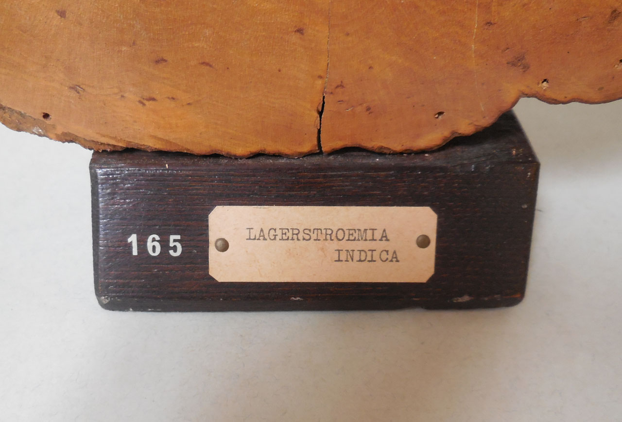 Il campione è una rondella di legno grezzo munito di corteccia, ricavata dal taglio trasversale di un tronco o di un ramo, successivamente sistemata su un supporto ligneo sul quale si trova un numero d'ordine e il cartellino che riporta il nome scientifico della specie. Sulla faccia è stata applicata della coppale. Il campione fa parte di una collezione nata grazie al lavoro del Prof. B. Longo e del Prof. A. Preda, direttori dell'Orto Botanico di Siena rispettivamente dal 1906-1915 e dal 1915-1921. Nella collezione vennero radunati i campioni raccolti dal Prof. A. Tassi e altri reperti legnosi provenienti dall'Orto, molti dei quali recuperati nel 1915 dalle piante strocatesi durante una nevicata. La collezione è stata incrementata fino alla fine degli anni '50 per merito del Prof. A. Nannizzi, direttore dell'Orto dal 1934 al 1950