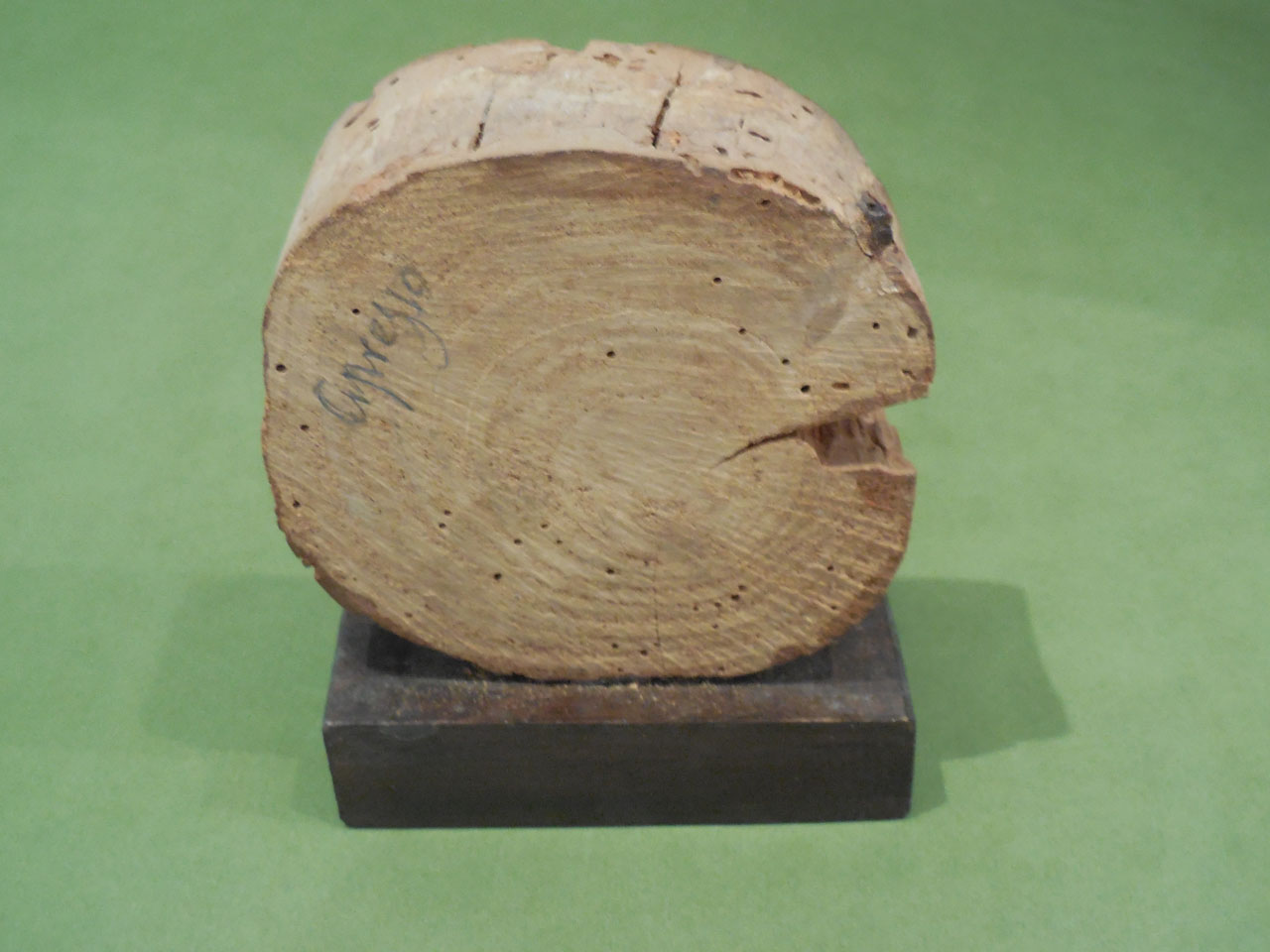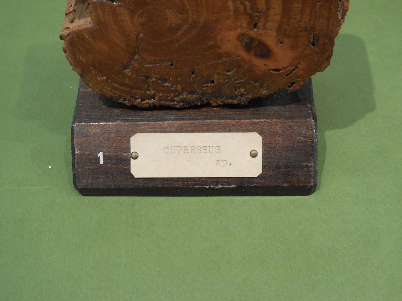 Il campione è una rondella di legno grezzo munito di corteccia, ricavata dal taglio trasversale di un tronco o di un ramo, successivamente sistemata su un supporto ligneo sul quale si trova un numero d'ordine e il cartellino che riporta il nome scientifico della specie. Sulla faccia è stata applicata della coppale mentre sul dorso è presente un' iscrizione. Il campione fa parte di una collezione nata grazie al lavoro del Prof. B. Longo e del Prof. A. Preda, direttori dell'Orto Botanico di Siena rispettivamente dal 1906-1915 e dal 1915-1921. Nella collezione vennero radunati i campioni raccolti dal Prof. A. Tassi e altri reperti legnosi provenienti dall'Orto, molti dei quali recuperati nel 1915 dalle piante strocatesi durante una nevicata. La collezione è stata incrementata fino alla fine degli anni '50 per merito del Prof. A. Nannizzi, direttore dell'Orto dal 1934 al 1950