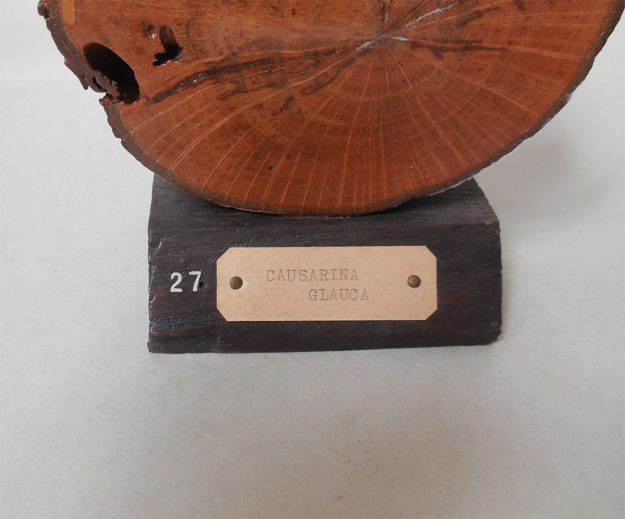Il campione è una rondella di legno grezzo munito di corteccia, ricavata dal taglio trasversale di un tronco o di un ramo, successivamente sistemata su un supporto ligneo sul quale si trova un numero d'ordine e il cartellino che riporta il nome scientifico della specie. Sulla faccia è stata applicata della coppale. Il campione fa parte di una collezione nata grazie al lavoro del Prof. B. Longo e del Prof. A. Preda, direttori dell'Orto Botanico di Siena rispettivamente dal 1906-1915 e dal 1915-1921. Nella collezione vennero radunati i campioni raccolti dal Prof. A. Tassi e altri reperti legnosi provenienti dall'Orto, molti dei quali recuperati nel 1915 dalle piante strocatesi durante una nevicata. La collezione è stata incrementata fino alla fine degli anni '50 per merito del Prof. A. Nannizzi, direttore dell'Orto dal 1934 al 1950