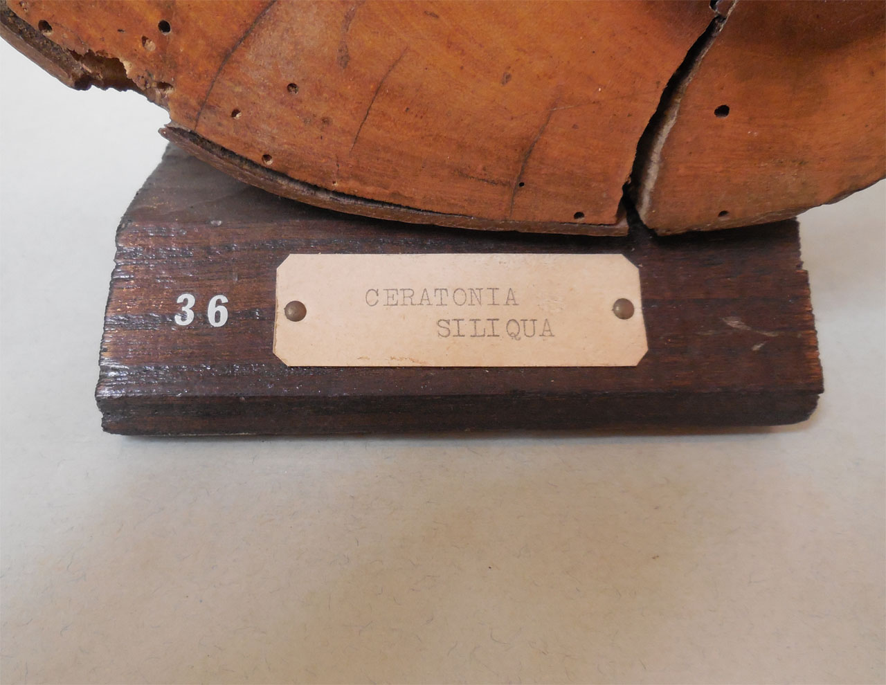 Il campione è una rondella di legno grezzo munito di corteccia, ricavata dal taglio trasversale di un tronco o di un ramo, successivamente sistemata su un supporto ligneo sul quale si trova un numero d'ordine e il cartellino che riporta il nome scientifico della specie. Sulla faccia è stata applicata della coppale mentre sul dorso è presente un' iscrizione. Il campione fa parte di una collezione nata grazie al lavoro del Prof. B. Longo e del Prof. A. Preda, direttori dell'Orto Botanico di Siena rispettivamente dal 1906-1915 e dal 1915-1921. Nella collezione vennero radunati i campioni raccolti dal Prof. A. Tassi e altri reperti legnosi provenienti dall'Orto, molti dei quali recuperati nel 1915 dalle piante strocatesi durante una nevicata. La collezione è stata incrementata fino alla fine degli anni '50 per merito del Prof. A. Nannizzi, direttore dell'Orto dal 1934 al 1950
