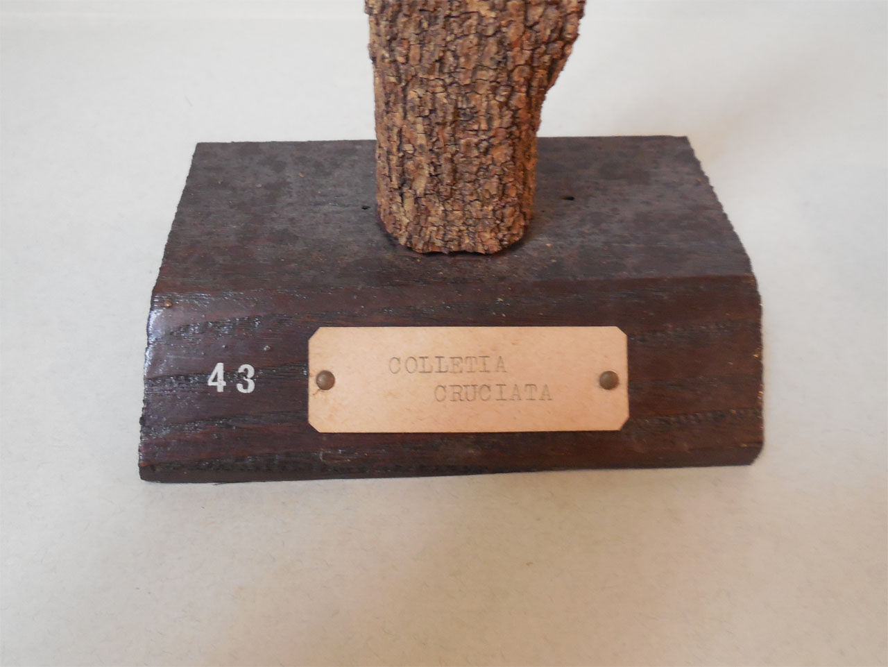 Il campione è uno spezzone di legno grezzo munito di corteccia, ricavato dal taglio di un tronco o di un ramo, successivamente sistemato su un supporto ligneo sul quale si trova un numero d'ordine e il cartellino che riporta il nome scientifico della specie. Sulla zona di taglio superiore è stata applicata della coppale. Il campione fa parte di una collezione nata grazie al lavoro del Prof. B. Longo e del Prof. A. Preda, direttori dell'Orto Botanico di Siena rispettivamente dal 1906-1915 e dal 1915-1921. Nella collezione vennero radunati i campioni raccolti dal Prof. A. Tassi e altri reperti legnosi provenienti dall'Orto, molti dei quali recuperati nel 1915 dalle piante strocatesi durante una nevicata. La collezione è stata incrementata fino alla fine degli anni '50 per merito del Prof. A. Nannizzi, direttore dell'Orto dal 1934 al 1950