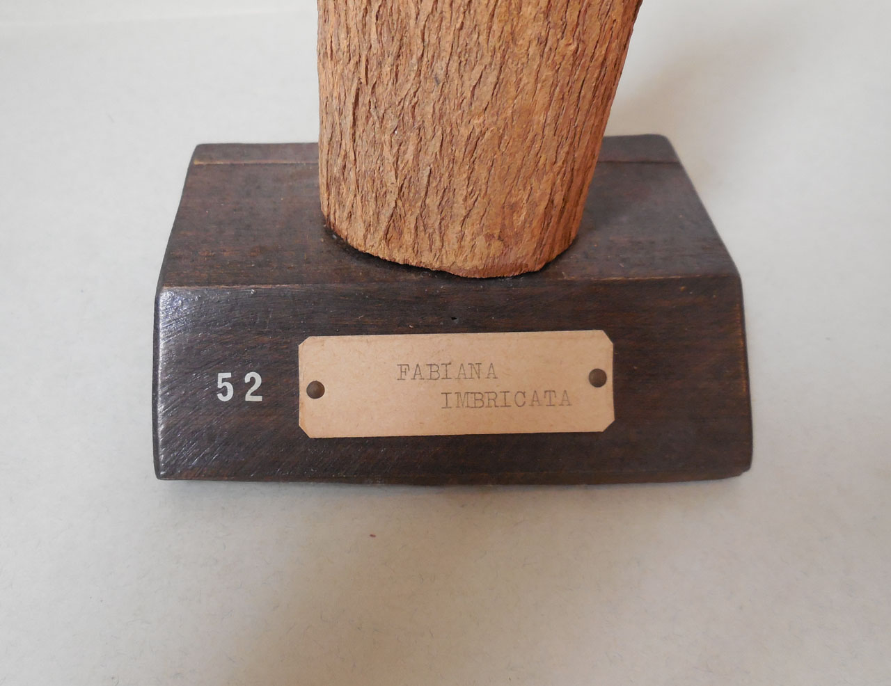 Il campione è uno spezzone di legno grezzo munito di corteccia, ricavato dal taglio di un tronco o di un ramo, successivamente sistemato su un supporto ligneo sul quale si trova un numero d'ordine e il cartellino che riporta il nome scientifico della specie. Sulla parte superiore del campione è stata eseguita una sezione radiale e su questa applicata della coppale. Il campione fa parte di una collezione nata grazie al lavoro del Prof. B. Longo e del Prof. A. Preda, direttori dell'Orto Botanico di Siena rispettivamente dal 1906-1915 e dal 1915-1921. Nella collezione vennero radunati i campioni raccolti dal Prof. A. Tassi e altri reperti legnosi provenienti dall'Orto, molti dei quali recuperati nel 1915 dalle piante strocatesi durante una nevicata. La collezione è stata incrementata fino alla fine degli anni '50 per merito del Prof. A. Nannizzi, direttore dell'Orto dal 1934 al 1950