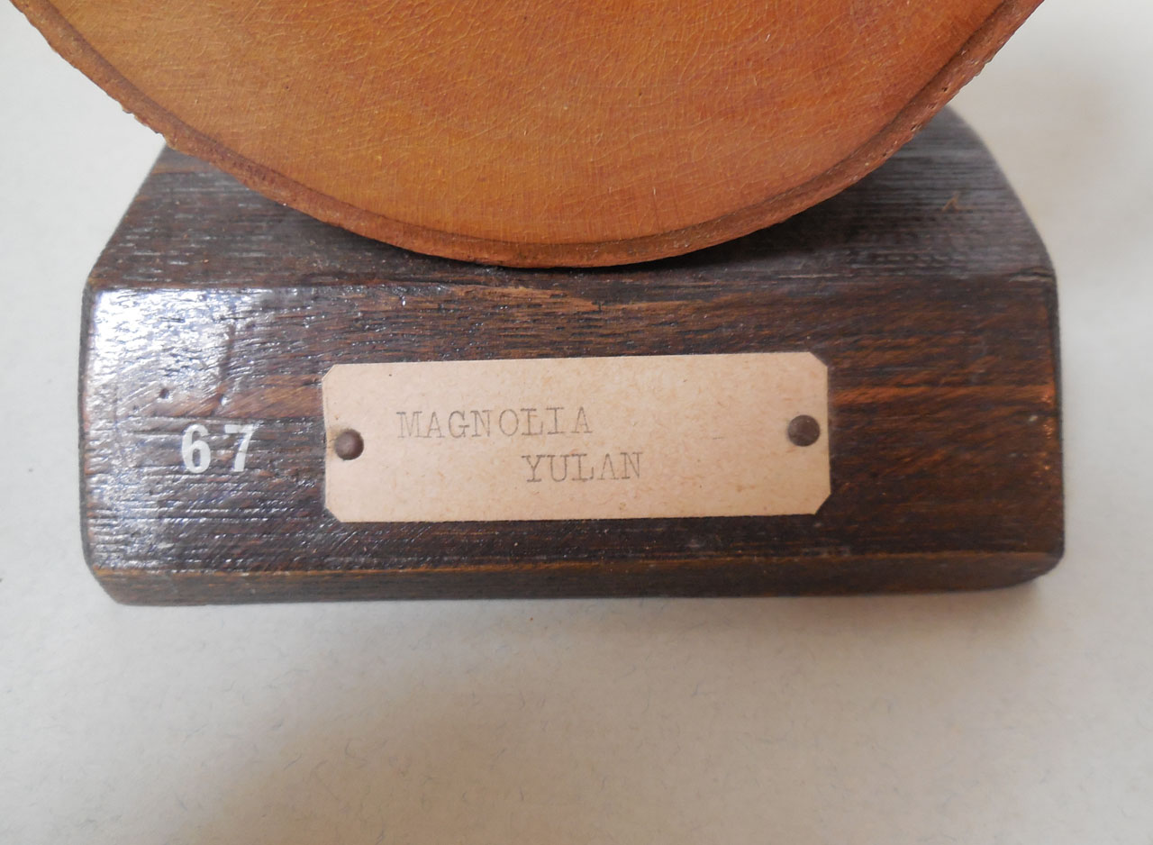 Il campione è una rondella di legno grezzo munito di corteccia, ricavata dal taglio trasversale di un tronco o di un ramo, successivamente sistemata su un supporto ligneo sul quale si trova un numero d'ordine e il cartellino che riporta il nome scientifico della specie. Sulla faccia è stata applicata della coppale mentre sul dorso è presente un'iscrizione. Il campione fa parte di una collezione nata grazie al lavoro del Prof. B. Longo e del Prof. A. Preda, direttori dell'Orto Botanico di Siena rispettivamente dal 1906-1915 e dal 1915-1921. Nella collezione vennero radunati i campioni raccolti dal Prof. A. Tassi e altri reperti legnosi provenienti dall'Orto, molti dei quali recuperati nel 1915 dalle piante strocatesi durante una nevicata. La collezione è stata incrementata fino alla fine degli anni '50 per merito del Prof. A. Nannizzi, direttore dell'Orto dal 1934 al 1950