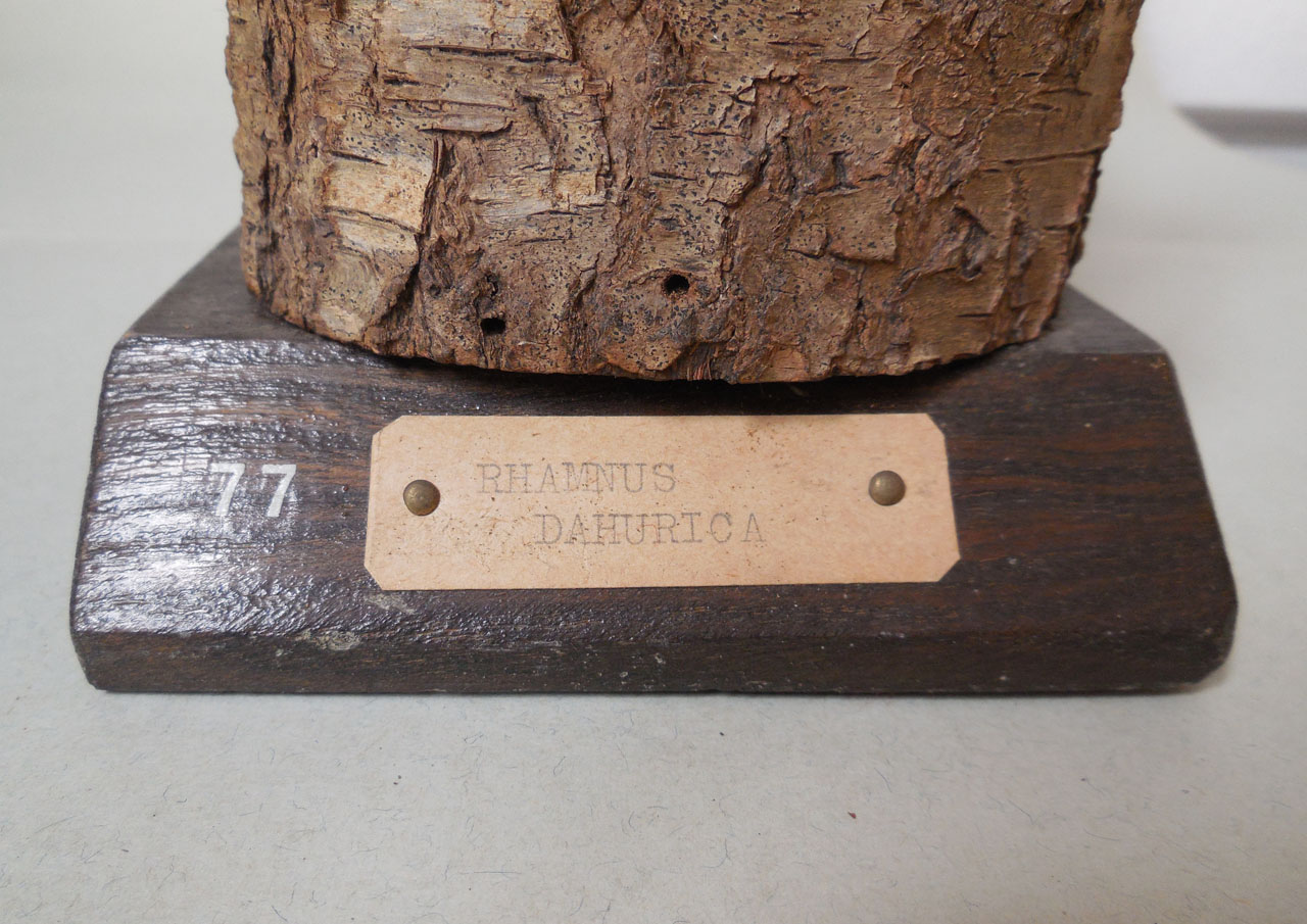 Il campione è uno spezzone di legno grezzo munito di corteccia, ricavato dal taglio di un tronco o di un ramo, successivamente sistemato su un supporto ligneo sul quale si trova un numero d'ordine e il cartellino che riporta il nome scientifico della specie. Sulla parte superiore del campione è stata eseguita una sezione radiale e su questa applicata della coppale. Il campione fa parte di una collezione nata grazie al lavoro del Prof. B. Longo e del Prof. A. Preda, direttori dell'Orto Botanico di Siena rispettivamente dal 1906-1915 e dal 1915-1921. Nella collezione vennero radunati i campioni raccolti dal Prof. A. Tassi e altri reperti legnosi provenienti dall'Orto, molti dei quali recuperati nel 1915 dalle piante strocatesi durante una nevicata. La collezione è stata incrementata fino alla fine degli anni '50 per merito del Prof. A. Nannizzi, direttore dell'Orto dal 1934 al 1950