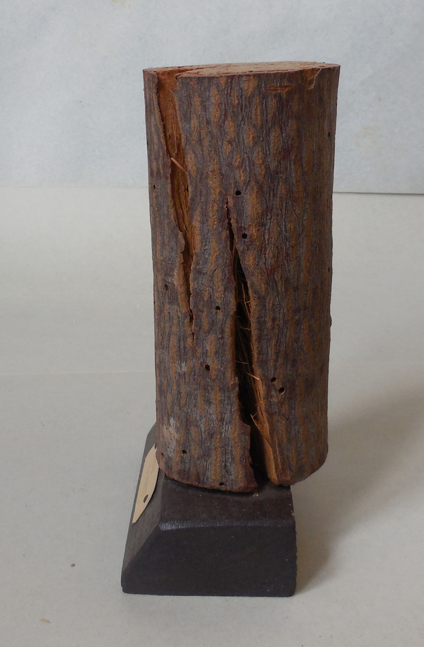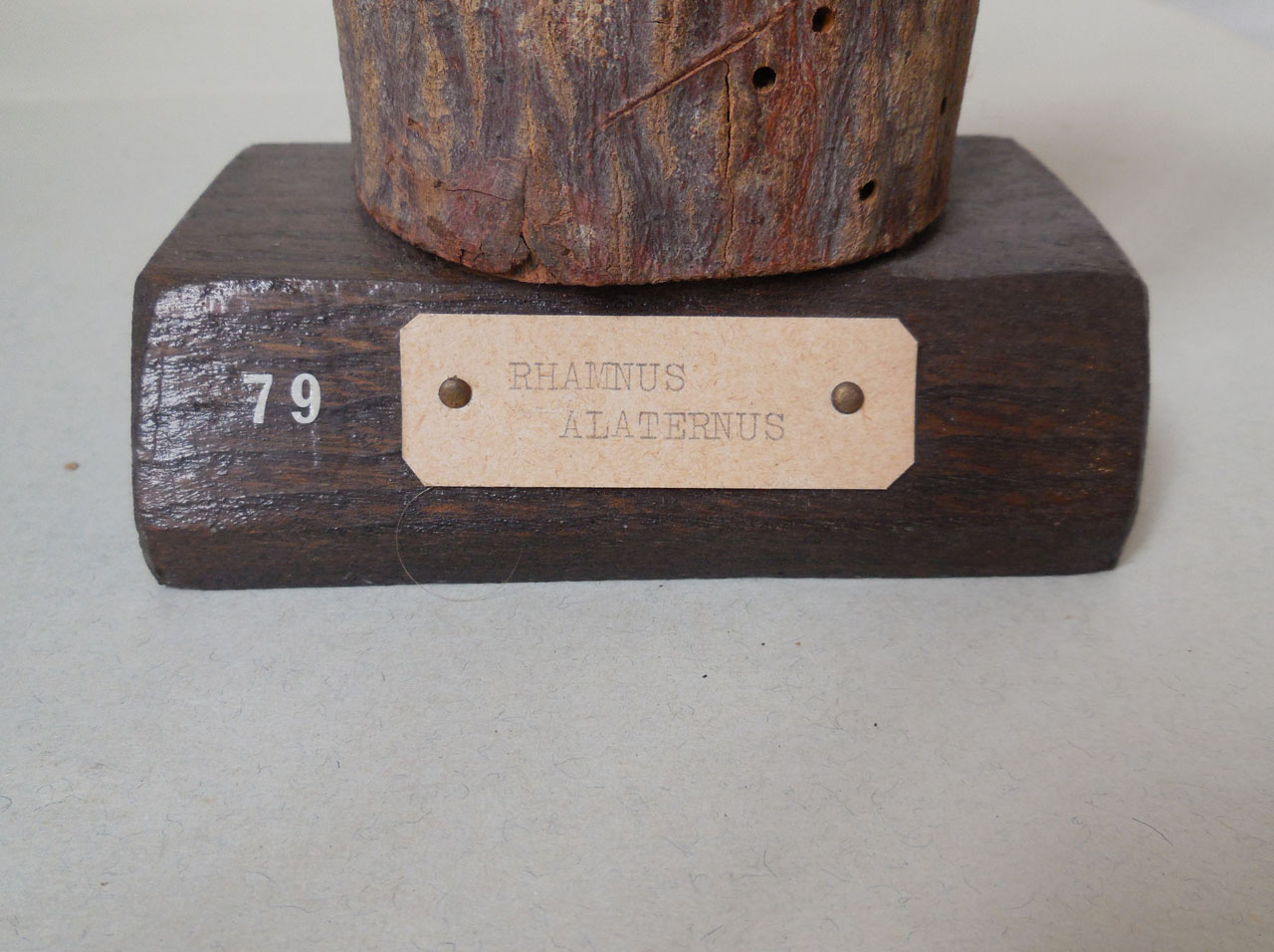 Il campione è uno spezzone di legno grezzo munito di corteccia, ricavato dal taglio di un tronco o di un ramo, successivamente sistemato su un supporto ligneo sul quale si trova un numero d'ordine e il cartellino che riporta il nome scientifico della specie. Sulla zona di taglio superiore è stata applicata della coppale. Il campione fa parte di una collezione nata grazie al lavoro del Prof. B. Longo e del Prof. A. Preda, direttori dell'Orto Botanico di Siena rispettivamente dal 1906-1915 e dal 1915-1921. Nella collezione vennero radunati i campioni raccolti dal Prof. A. Tassi e altri reperti legnosi provenienti dall'Orto, molti dei quali recuperati nel 1915 dalle piante strocatesi durante una nevicata. La collezione è stata incrementata fino alla fine degli anni '50 per merito del Prof. A. Nannizzi, direttore dell'Orto dal 1934 al 1950