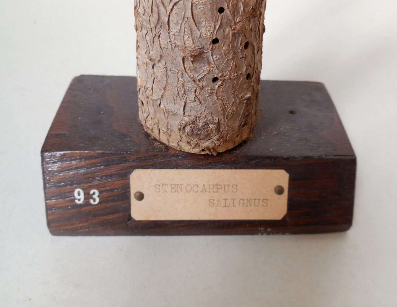 Il campione è uno spezzone di legno grezzo munito di corteccia, ricavato dal taglio di un tronco o di un ramo, successivamente sistemato su un supporto ligneo sul quale si trova un numero d'ordine e il cartellino che riporta il nome scientifico della specie. Il campione fa parte di una collezione nata grazie al lavoro del Prof. B. Longo e del Prof. A. Preda, direttori dell'Orto Botanico di Siena rispettivamente dal 1906-1915 e dal 1915-1921. Nella collezione vennero radunati i campioni raccolti dal Prof. A. Tassi e altri reperti legnosi provenienti dall'Orto, molti dei quali recuperati nel 1915 dalle piante strocatesi durante una nevicata. La collezione è stata incrementata fino alla fine degli anni '50 per merito del Prof. A. Nannizzi, direttore dell'Orto dal 1934 al 1950