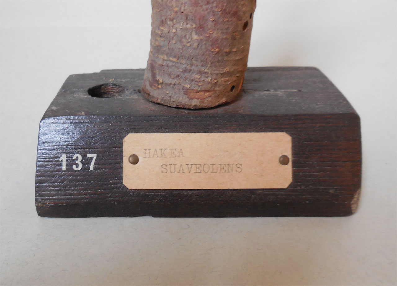 Il campione è uno spezzone di legno grezzo munito di corteccia, ricavato dal taglio di un tronco o di un ramo, successivamente sistemato su un supporto ligneo sul quale si trova un numero d'ordine e il cartellino che riporta il nome scientifico della specie. Sulla zona di taglio superiore è stata applicata della coppale. Il campione fa parte di una collezione nata grazie al lavoro del Prof. B. Longo e del Prof. A. Preda, direttori dell'Orto Botanico di Siena rispettivamente dal 1906-1915 e dal 1915-1921. Nella collezione vennero radunati i campioni raccolti dal Prof. A. Tassi e altri reperti legnosi provenienti dall'Orto, molti dei quali recuperati nel 1915 dalle piante strocatesi durante una nevicata. La collezione è stata incrementata fino alla fine degli anni '50 per merito del Prof. A. Nannizzi, direttore dell'Orto dal 1934 al 1950