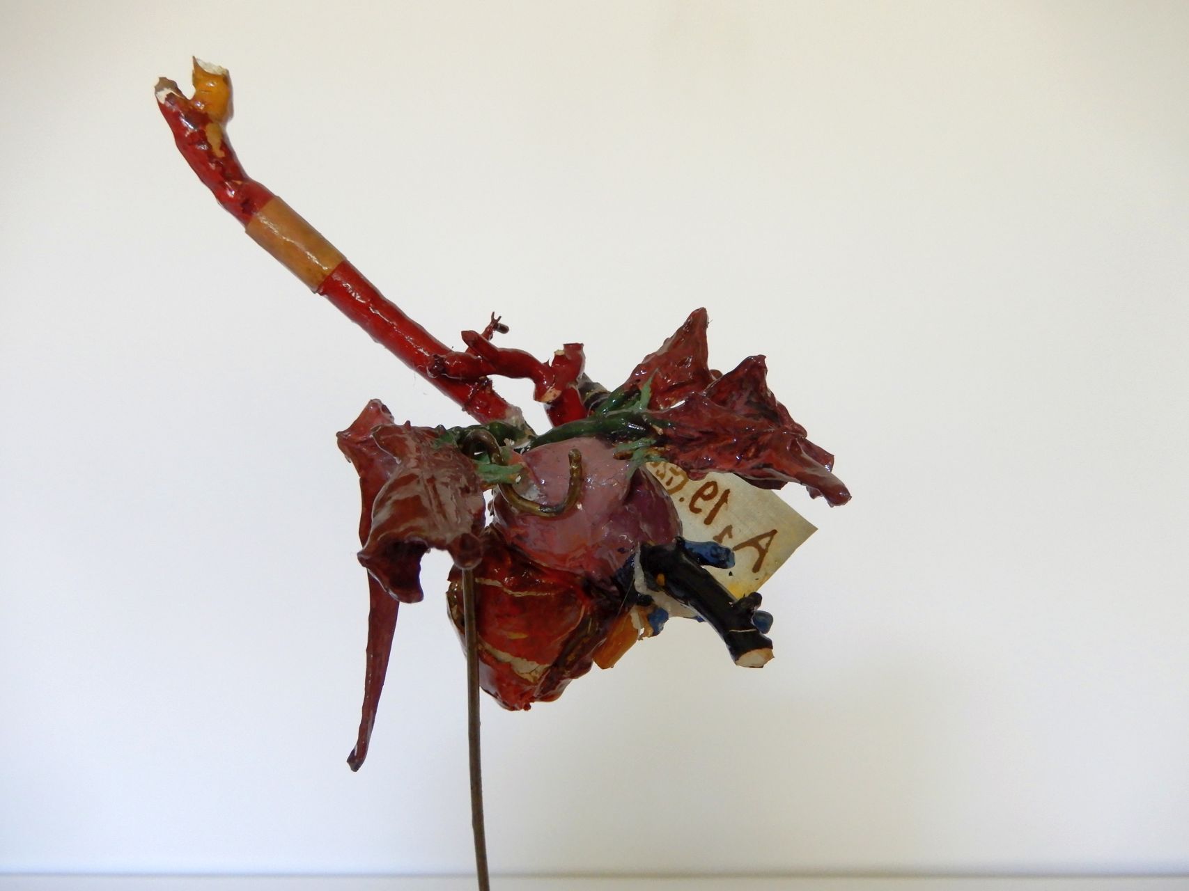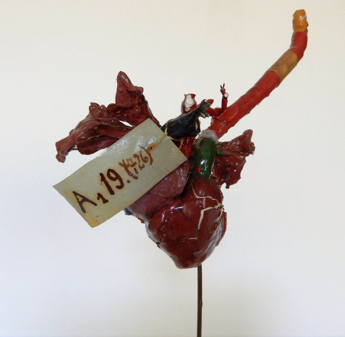 preparato rosso verde e blu montato su un'asta metallica poggiante su un piedistallo ligneo circolare