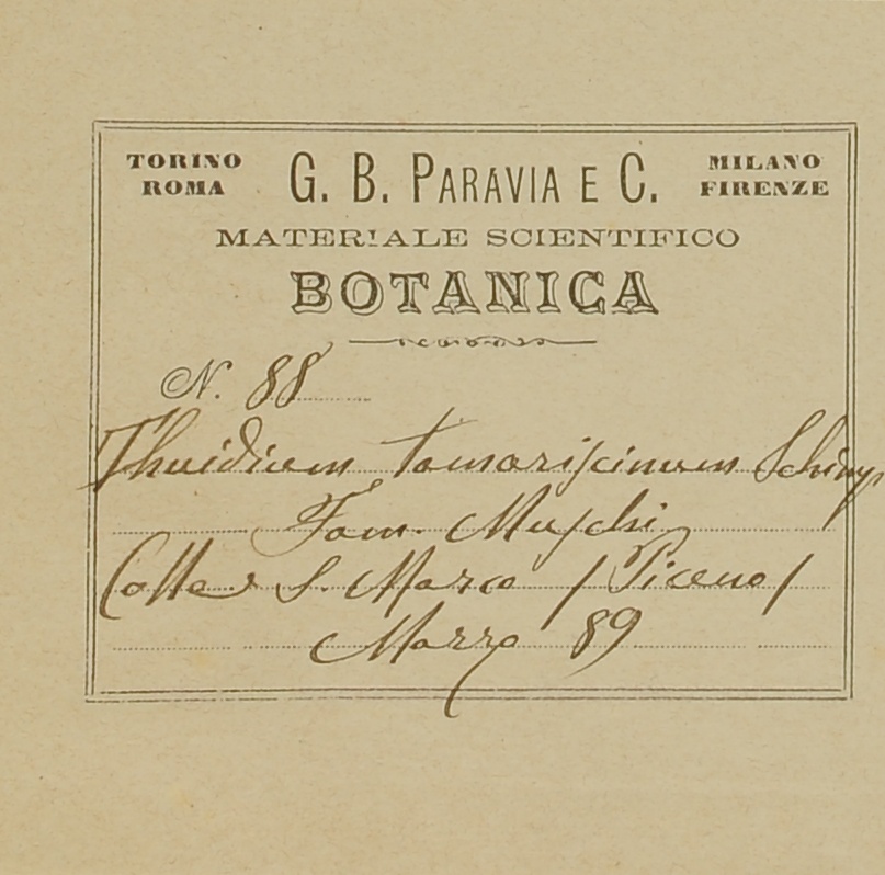 Questa scheda figlia si riferisce al campione collocato in basso, a sinistra. Si tratta di un esemplare di Thuidium tamariscinum Schimp. Il nome comune della specie è muschio. Il campione è fissato su un cartoncino bianco, il quale a sua volta, è incollato sul foglio di erbario. L'esemplare è dotato di una propria etichetta, posta in basso rispetto all'esemplare. L'etichetta è numerata con il numero 88, inoltre riporta i dati tassonomici e i dati di raccolta dell'epoca in cui il foglio è stato assemblato dalla casa editrice. La specie è stata pubblicata da: Wilhelm Philipp Schimper, in: Bryologia Europaea, 5: 163. 482, 483 (fasc. 49-51 Mon. 7. 2, 3.) (1852)