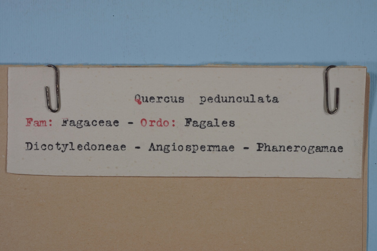 - NOTIZIE STORICO CRITICHE Esemplare essiccato di Quercus robur L. disposto su un foglio di erbario con una didascalia manoscritta. Una ulteriore didascalia è scritta su un piccolo foglio fissato con due fermagli alla cartellina cartacea in cui è inserito il foglio di erbario. Il nome comune della specie è farnia. La specie è stata pubblicata da: Carl Linnaeus, in: Species Plantarum, II: 996, 1753. Un sinonimo della specie è Quercus peduncolata Ehrh. Il foglio di erbario, insieme ad altri, costituiva il Gabinetto di Fisica e Storia Naturale del Seminario Regionale "Pianum" Abruzzo e Molise