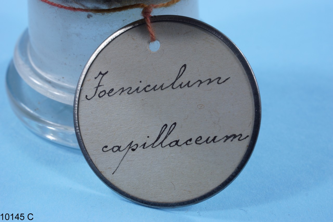 - NOTIZIE STORICO CRITICHE Barattolo in vetro contenente semi di Foeniculum vulgare Mill. La specie è stata pubblicata da: Philip Miller, in: The Gardeners Dictionary, (ed. 8) s.v. Foeniculum no. 1 1768. Il nome comune della specie è finocchio. Il barattolo, insieme ad altri beni botanici, costituiva il Gabinetto di Fisica e di Storia Naturale del Seminario Regionale "Pianum" Abruzzo e Molise