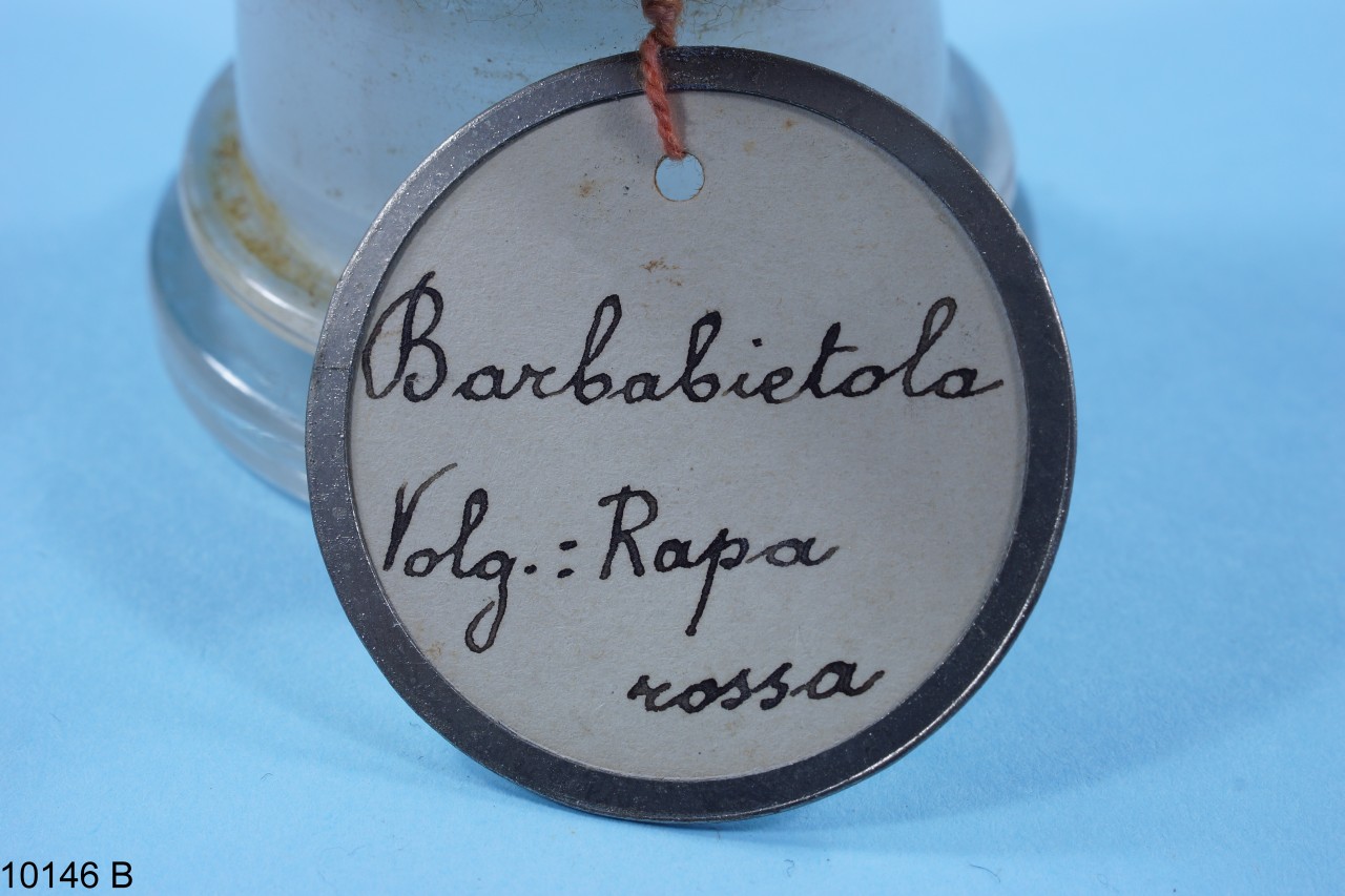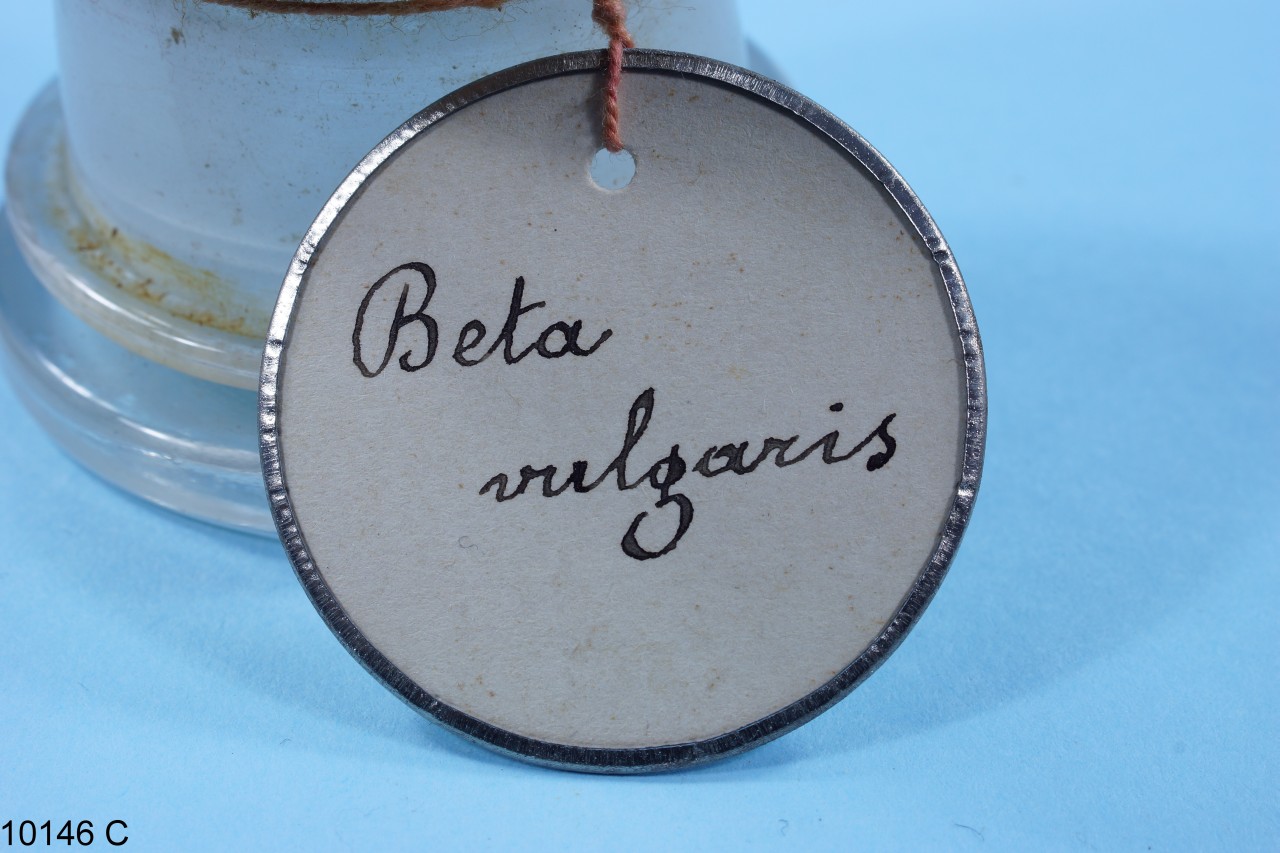 - NOTIZIE STORICO CRITICHE Barattolo in vetro contenente semi di Beta vulgaris L. La specie è stata pubblicata da: Carl Linnaeus, in: Species Plantarum, 1: 222 . 1753. I nomi comuni della specie sono bietola o barbabietola. Il barattolo, insieme ad altri beni botanici, costituiva il Gabinetto di Fisica e di Storia Naturale del Seminario Regionale "Pianum" Abruzzo e Molise