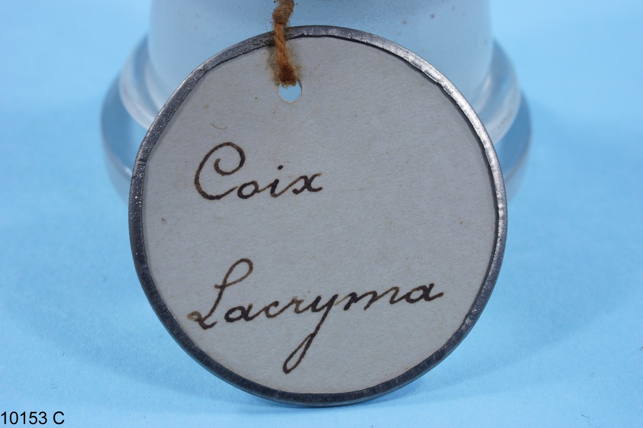 - NOTIZIE STORICO CRITICHE Barattolo in vetro contenente frutti di Coix lacryma-jobi L. La specie è stata pubblicata da: Carl Linnaeus, in: Species Plantarum, 2: 972. 1753. Il nome comune della specie è lacrima di Giobbe. Il barattolo, insieme ad altri beni botanici, costituiva il Gabinetto di Fisica e di Storia Naturale del Seminario Regionale "Pianum" Abruzzo e Molise