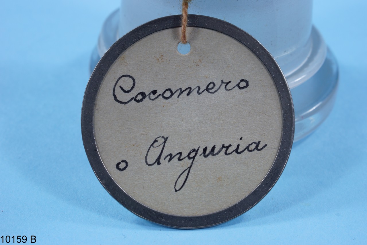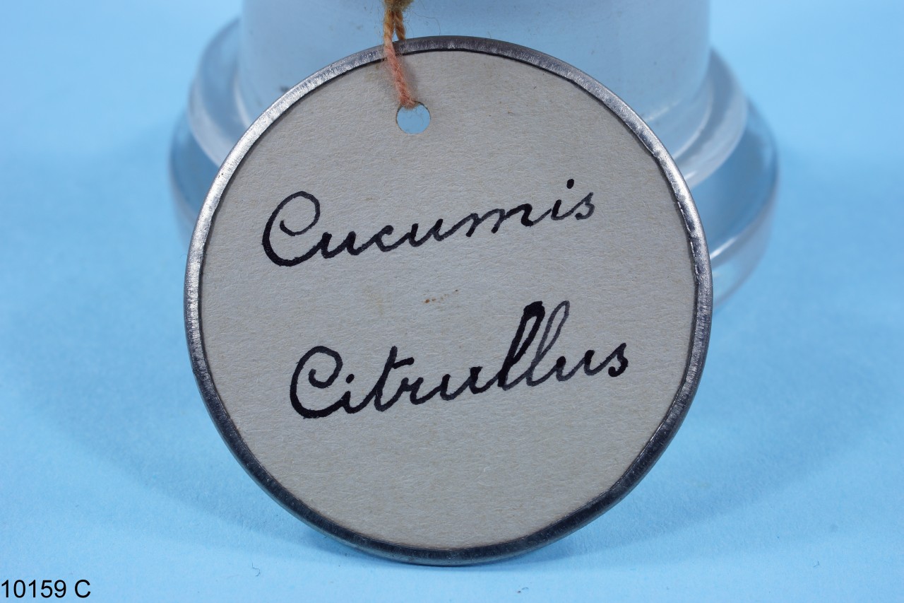 - NOTIZIE STORICO CRITICHE Barattolo in vetro contenente semi Citrullus lanatus (Thunb.) Matsum. & Nakai. La specie è stata pubblicata da: Ninzo Matsamura e Takenoshin Nakai, in: Catalogus Seminum et Sporarum in Horto Botanico Universitatis Imperialis Tokyoensis per annos 1915 et 1916, 30, no. 854. 1916. Il nome comune dells specie è anguria. Il barattolo, insieme ad altri beni botanici, costituiva il Gabinetto di Fisica e di Storia Naturale del Seminario Regionale "Pianum" Abruzzo e Molise