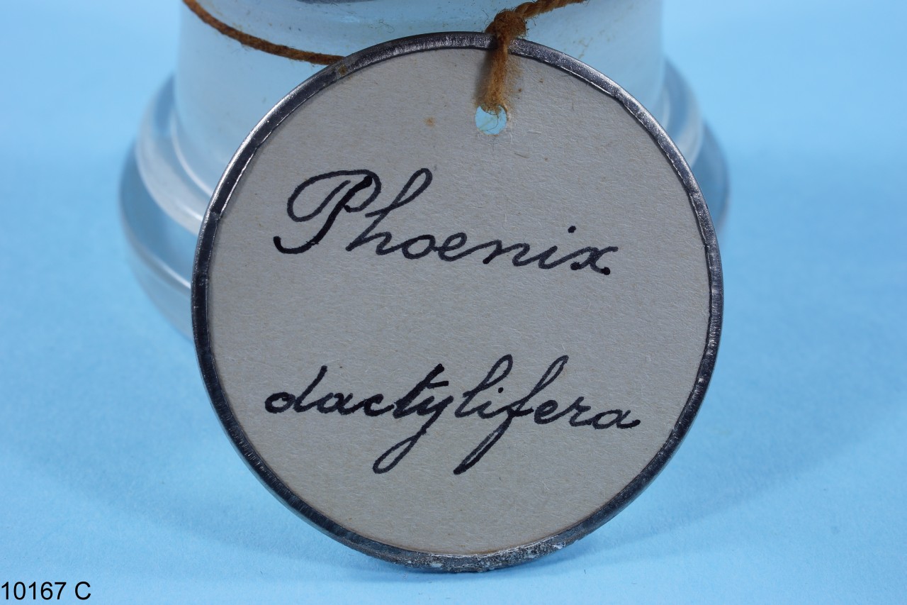 - NOTIZIE STORICO CRITICHE Barattolo in vetro contenente semi di Phoenix dactylifera L. La specie è stata pubblicata da: Carl Linnaeus, in: Species Plantarum, 2: 1188. 1753. Il nome comune della specie è palma da datteri. Il barattolo, insieme ad altri beni botanici, costituiva il Gabinetto di Fisica e di Storia Naturale del Seminario Regionale "Pianum" Abruzzo e Molise