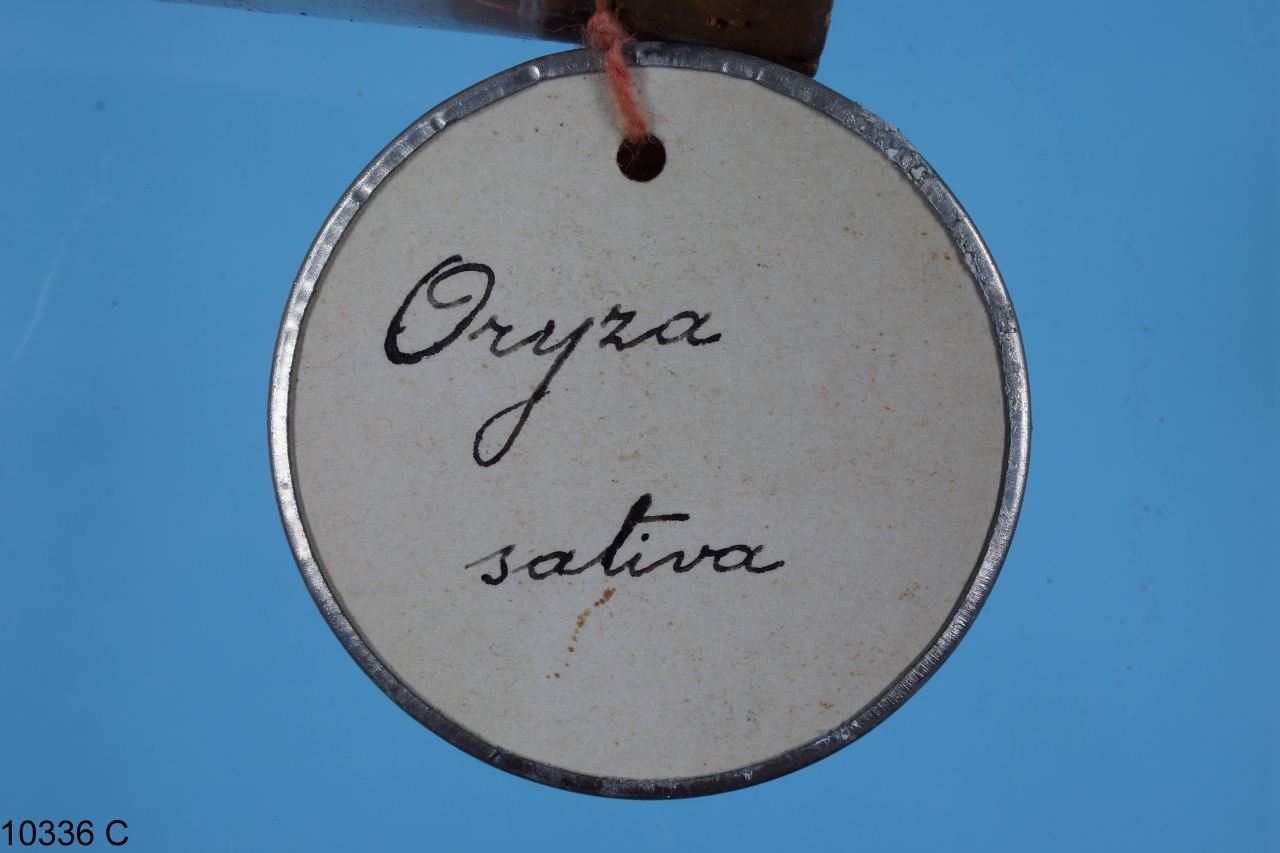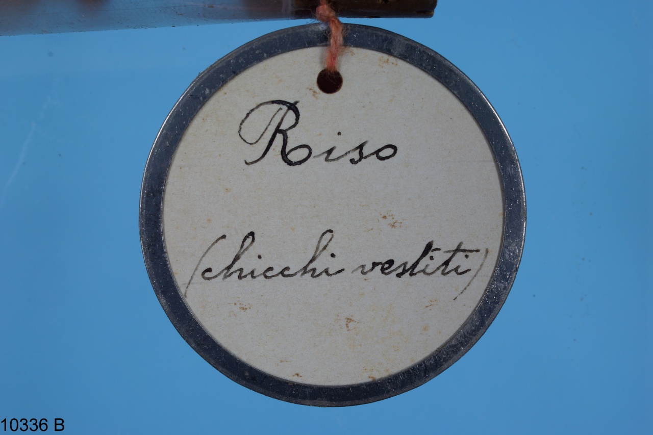 - NOTIZIE STORICO CRITICHE Provetta in vetro con tappo in sughero contenente cariossidi di Oryza sativa L. Il nome comune della specie è riso. La specie è stata pubblicata da: Carl Linnaeus, in: Species Plantarum, I: 333, 1753. Insieme ad altri beni botanici, costituiva il Gabinetto di Fisica e Storia Naturale del Seminario Regionale "Pianum" Abruzzo e Molise
