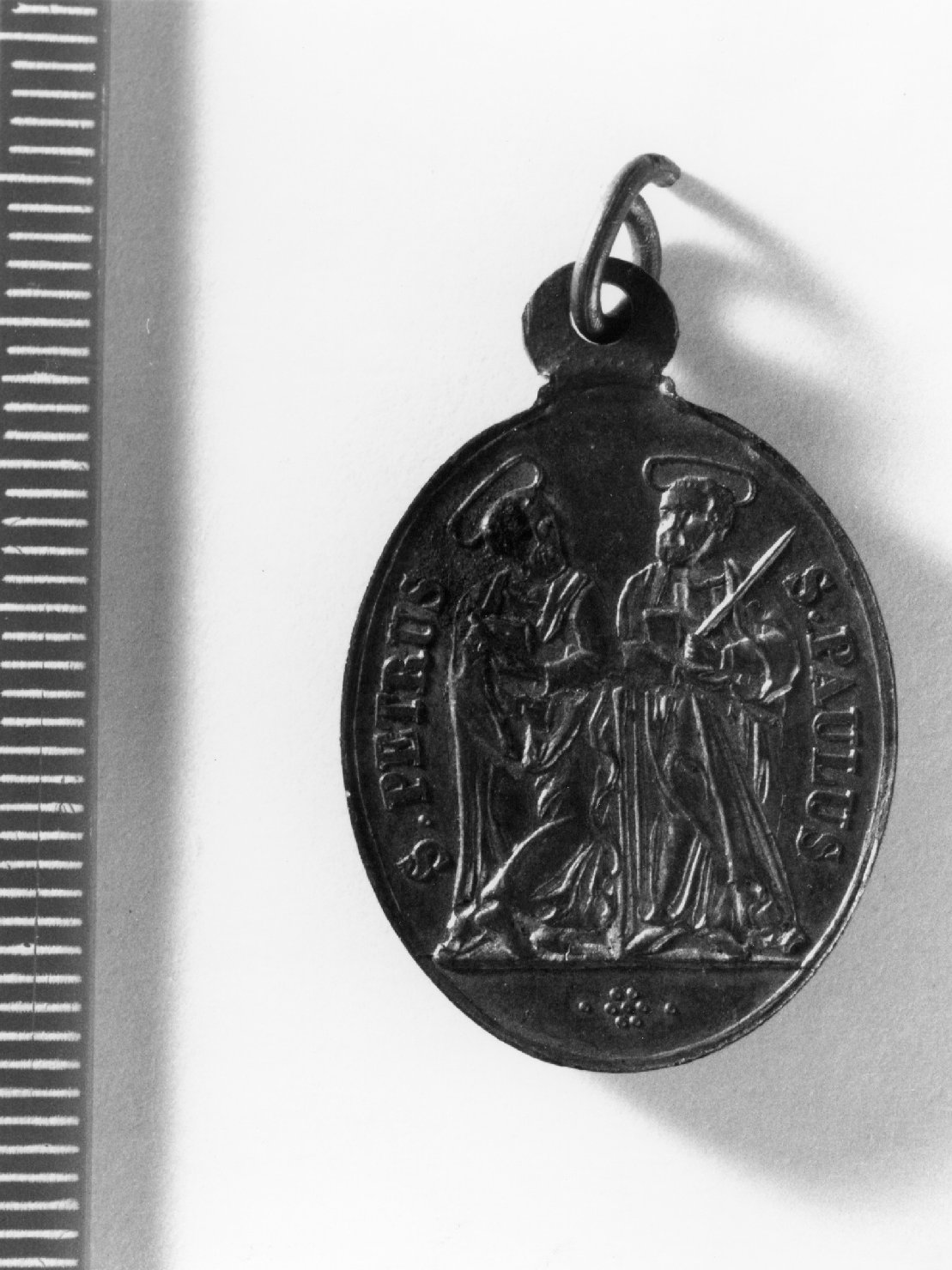 Dritto: Busto di Pio IX con berretto, mozzetta e stola a d. Rovescio: San Pietro, con le chiavi nella d. e libro nella s., e San Paolo, con la spada nella s. e libro nella d., a figura intera, frontali