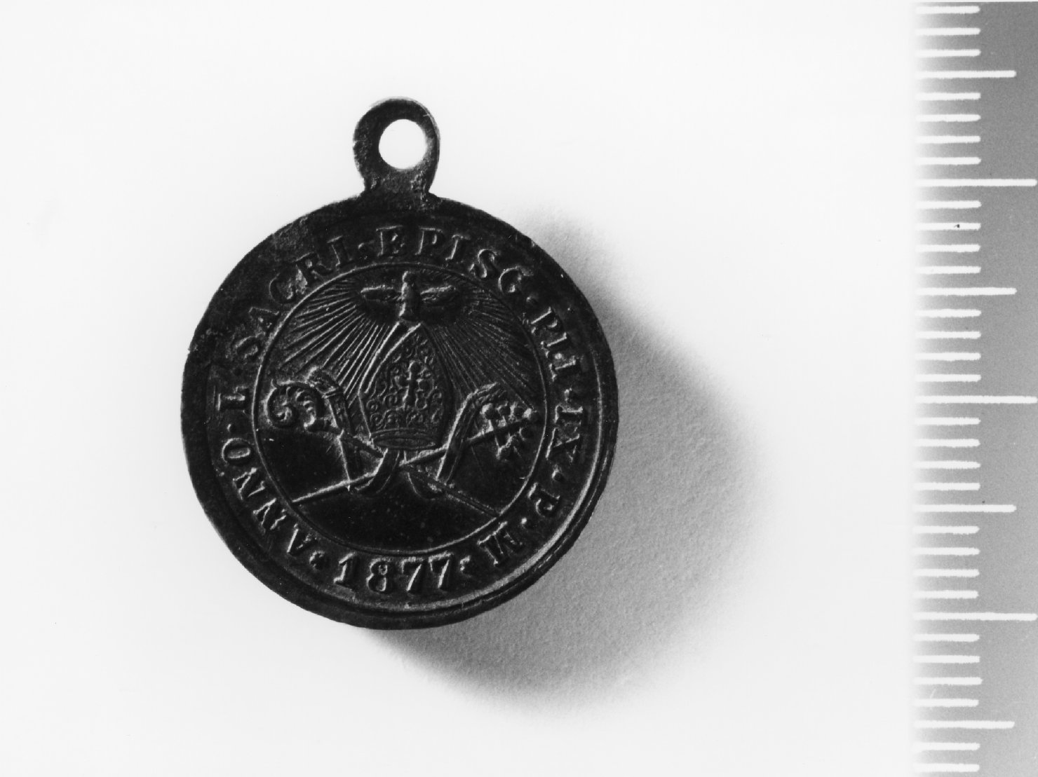 Dritto: Busto di Pio IX con piviale e tiara a d.; con appiccagnolo. Rovescio: Croce patriarcale e pastorale incrociate e sormontate da mitria con pendagli