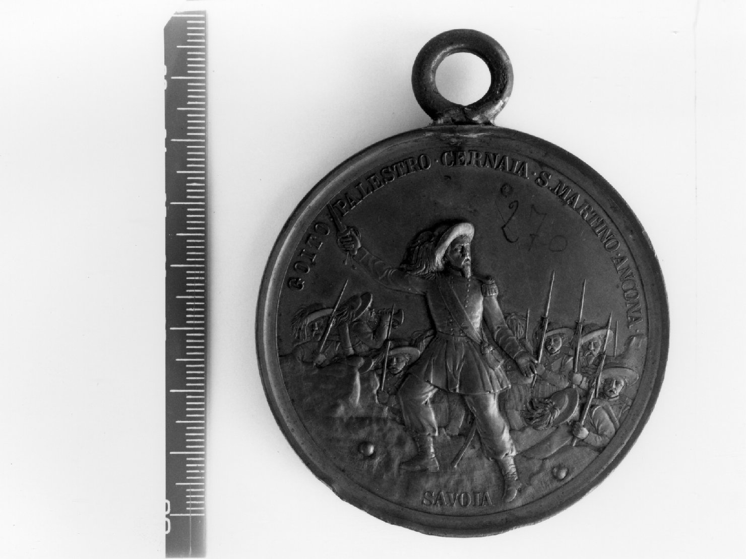 Dritto: Busto di Alessandro la Marmora in uniforme militare a d.; con appiccagnolo. Rovescio: La Marmora con la spada sguainata in atto di condurre all'assalto i suoi bersaglieri