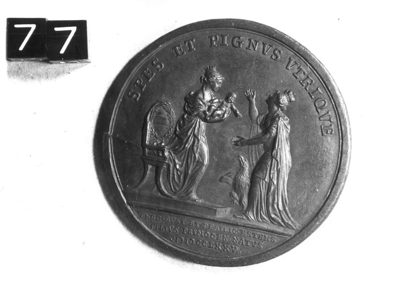 Dritto: Busti accollati a destra, il principe Francesco con i capelli sciolti che scendono sulle spalle. Rovescio: L'Austra si alza da un trono e presenta un neonato alla Casa d'Este raffigurata da una donna con l'aquila