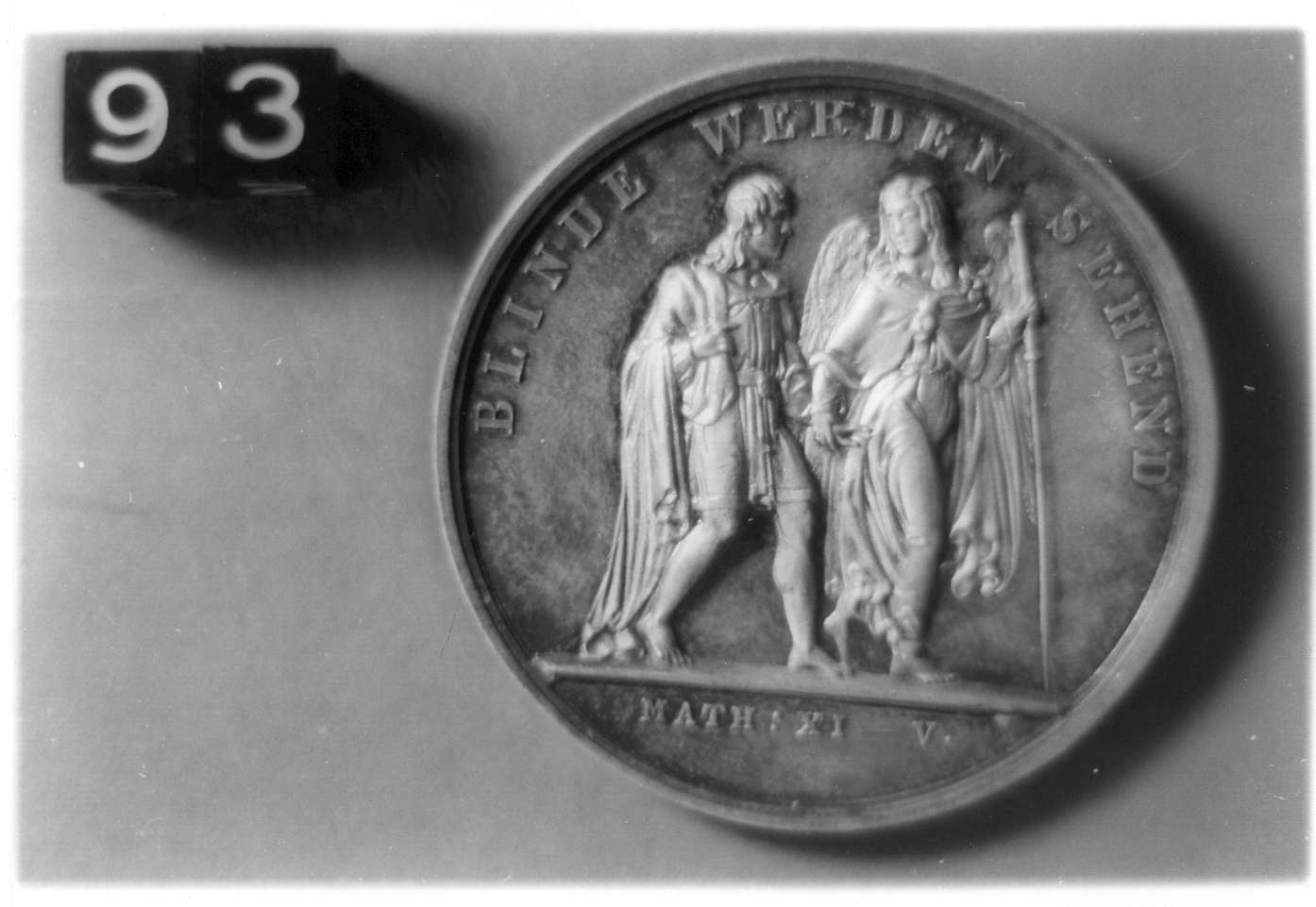 Dritto: Busto di profilo a sinistra ampia basetta sulla guancia e capelli corti divisi sulla fronte. Rovescio: Giovane cieco in veste medioevale con ampio mantello dalla spalla destra al suolo, a destra figura alata che tiene nella mano destra la mano del non vedente e alla mano sinistra un bastone con veste lunga e mantell svolazzante