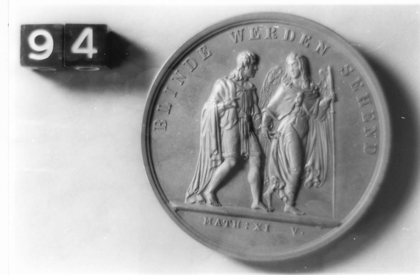 Dritto: Busto di profilo a sinistra ampia basetta sulla guancia e capelli corti divisi sulla fronte. Rovescio: Giovane cieco in veste medioevale con ampio mantello dalla spalla destra al suolo, a destra figura alata che tiene nella mano destra la mano del non vedente e alla mano sinistra un bastone con veste lunga e mantell svolazzante