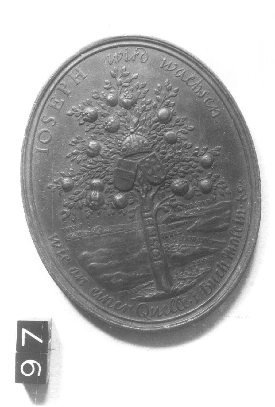 Dritto: Busto a sinistra con testa rivolta a destra, tratti giovanili e capelli mossi, faccia glabra, veste all'antica con lorica e collare col Toson d'oro; sulle spalle mantello trattenuto a destra in alto la mano divina porge la corona d'Ungheria. Rovescio: Melograno sopra la confluenza del Danubio con le città di Essek, Buda, Bratislava e Vienna; sull'albero ricolmo di frutti, il nome dell'imperatore inciso sul tronco e gli scudi d'Austria e Lorena sotto la corona d'Ungheria