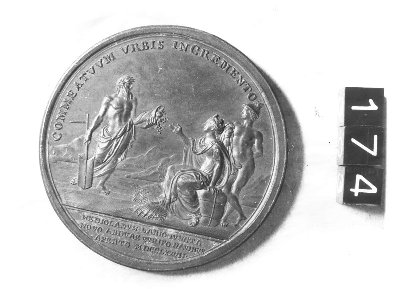 Dritto: Busto di profilo con diadema in capo e velo di vedovanza che scende sul petto. Rovescio: A destra la città di Milano, figura femminile turrita seduta con merci e grano sotto di lei, riceve dall'Adda sotto i tratti di un vecchio con un timone nella mano destra, una cornucopia; dietro la figura di Milano, Mercurio stantecon una borsa di denari. Nello sfondo il lago di Como