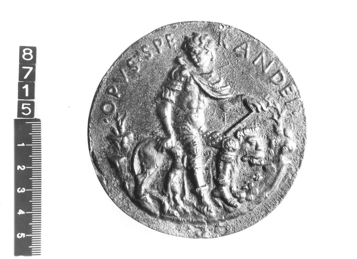Dritto: Busto di Marino Caracciolo verso sinistra con berretto sopra zazzera che scende fin sul collo, indossa un'armatura sopra la cotta metallica. Rovescio: Uomo con armatura all'antica e mantello fissato sulla spalla destra seduto sul dorso di un leone entro paesaggio roccioso tra due alberelli, nella sinistra regge il bastone di comando, mentre con la destra accarezza un piccolo cane ritto sulle zampe posteriori