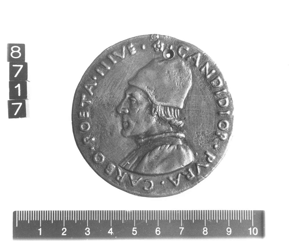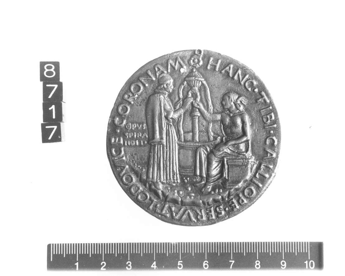 Dritto: Busto di Ludovico Carbone verso sinistra, con alto berretto. Rovescio: Su un prato fiorito e di fronte a una fonte l'umanista in piedi e a sinistra riceve una corona dalle muse Calliope, assisa a destra e su un basso sedile cubico
