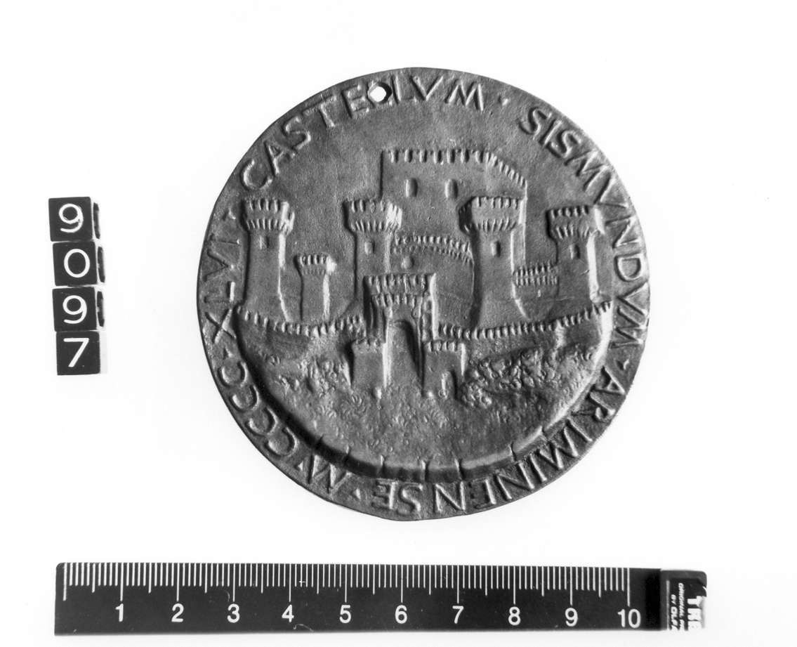Dritto: Busto di Sigismondo Pandolfo Malatesta verso sinistra, con armatura a piastre metalliche. Rovescio: Veduta di Castel Sismondo a Rimini