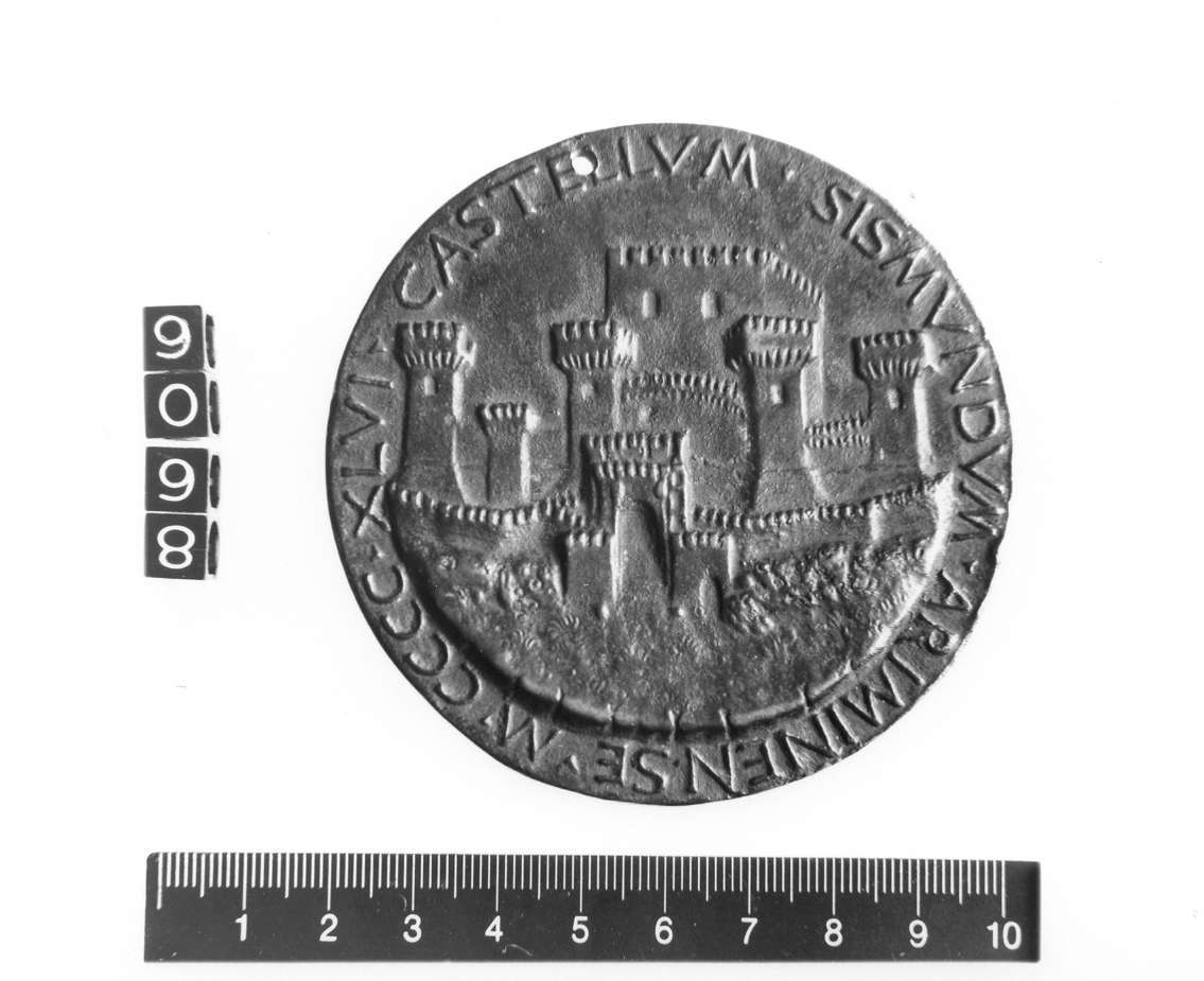 Dritto: Busto di Sigismondo Pandolfo Malatesta verso sinistra, con armatura a piastre metalliche. Rovescio: Veduta di Castel Sismondo a Rimini