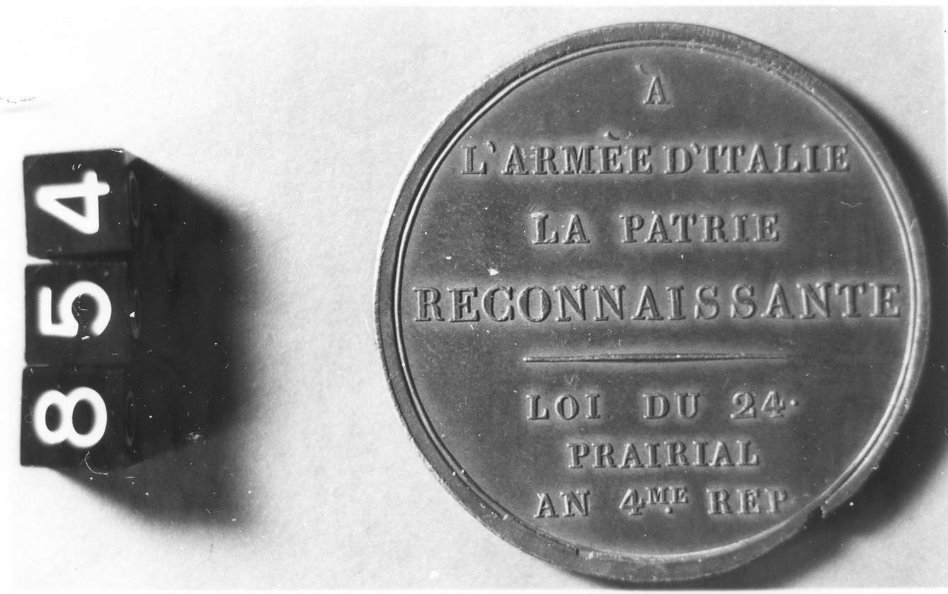 Dritto: Il generale A. Berthier (?) a cavallo verso destra, passa in testa ai suoi soldati, sul ponte di Lodi. Rovescio: Iscrizione in campo liscio, in 4 + 3 righe; la quarta riga è con caratteri di modulo maggiore