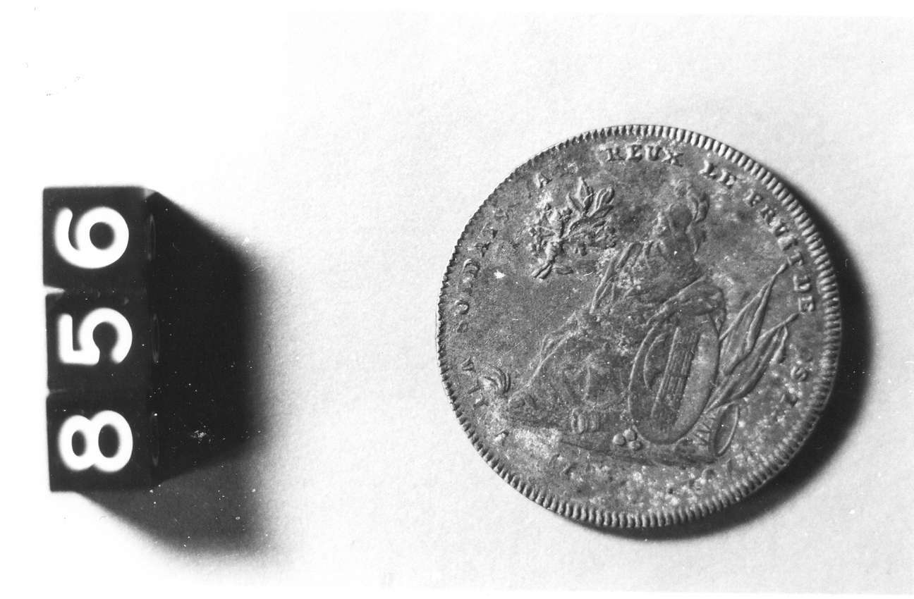 Dritto: Busto a destra in divisa, a capo scoperto, capelli lunghi e codino con nastro svolazzante. Rovescio: Nel campo, Minerva, con elmo e cimiero, seduta a sinistra, tiene nella mano destra un ramoscello di quercia e di ulivo; ha la mano sinistra su uno scudo con fascio e scure; sulla linea a terra un fusto di cannone, tre palle, un tamburo e due bandiere alzate