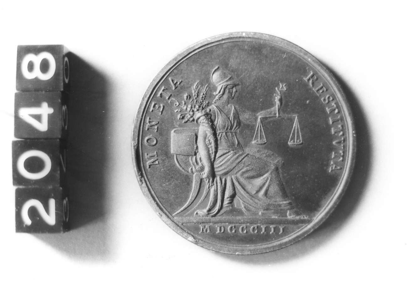 Dritto: Busto a sinistra, con berrettino, mozzetta e stola. Rovescio: Roma galeata seduta a destra, tiene nella mano destra una cornucopia e nella sinistra una bilancia