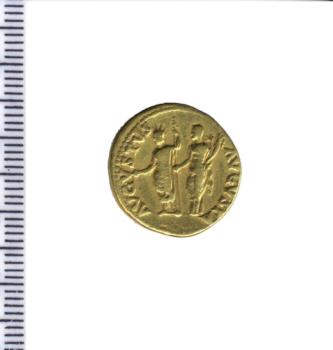 Dritto: Testa di Nerone con corona d'alloro a destra. Rovescio: Imperatore (Augusto o Nerone?) con corona radiata e toga stante a sinistra, tiene nella mano destra una patera, nella sinistra un lungo scettro; al suo fianco, l'imperatrice velata che tiene a sua volta una patera nella destra e una cornucopia nella sinistra