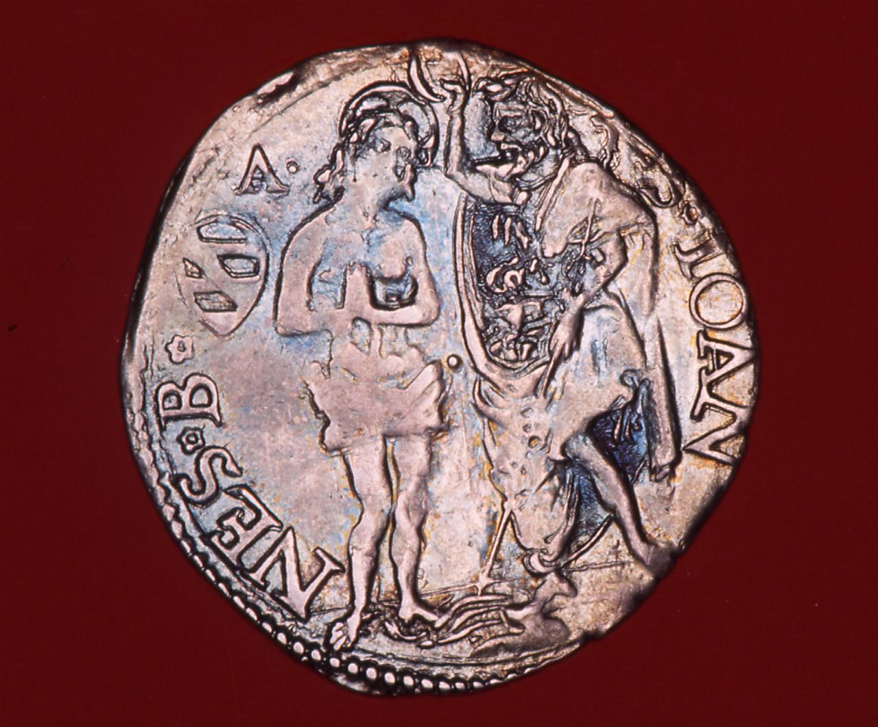 Dritto: Stemma della città di Firenze. bordo perlato. Rovescio: Battesimo di Cristo: San Giovanni a d. Cristo a s. accanto a braccio s. di Cristo stemma: A sormontante lo scudo, banda attraversante, fasciato