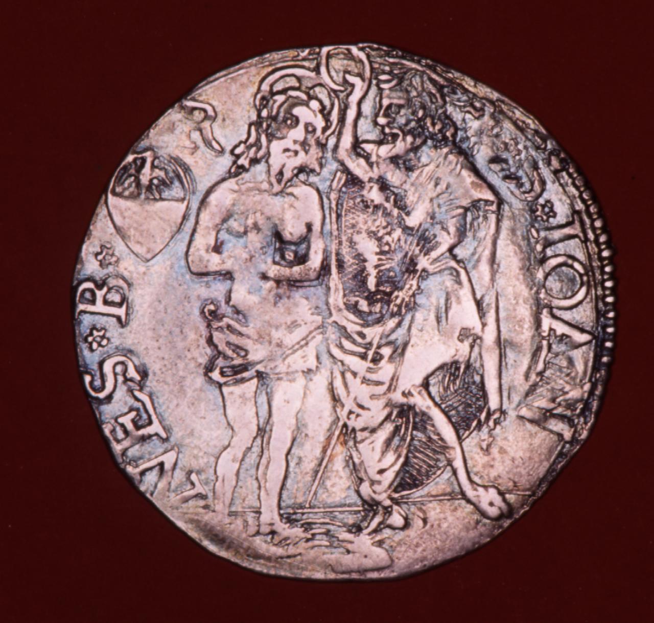 Dritto: Stemma della città di Firenze, scritta al bordo. bordo perlato. Rovescio: Battesimo di Cristo: San Giovanni a d. Cristo a s. accanto a braccio s. di Cristo stemma: R sormontante lo scudo. Iscrizione sul bordo, Bordo perlato