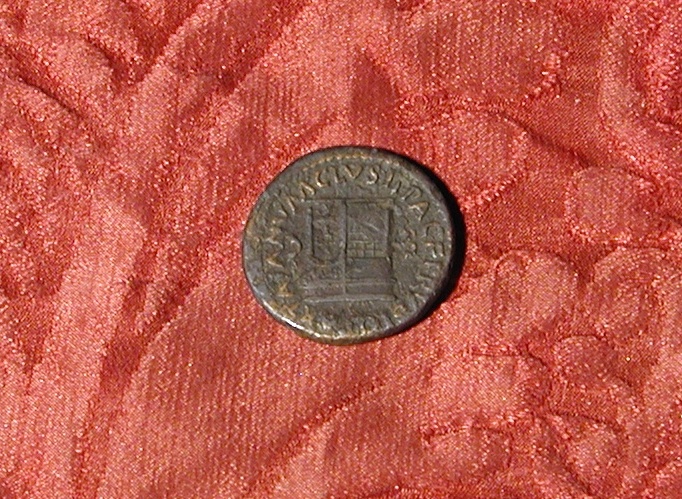 Dritto: testa laureata di Nerone, di profilo, a d.; c. perlinato. Rovescio: tempio di Giano, ornato con ghirlanda (?), con porta chiusa a d.; c.perlinato